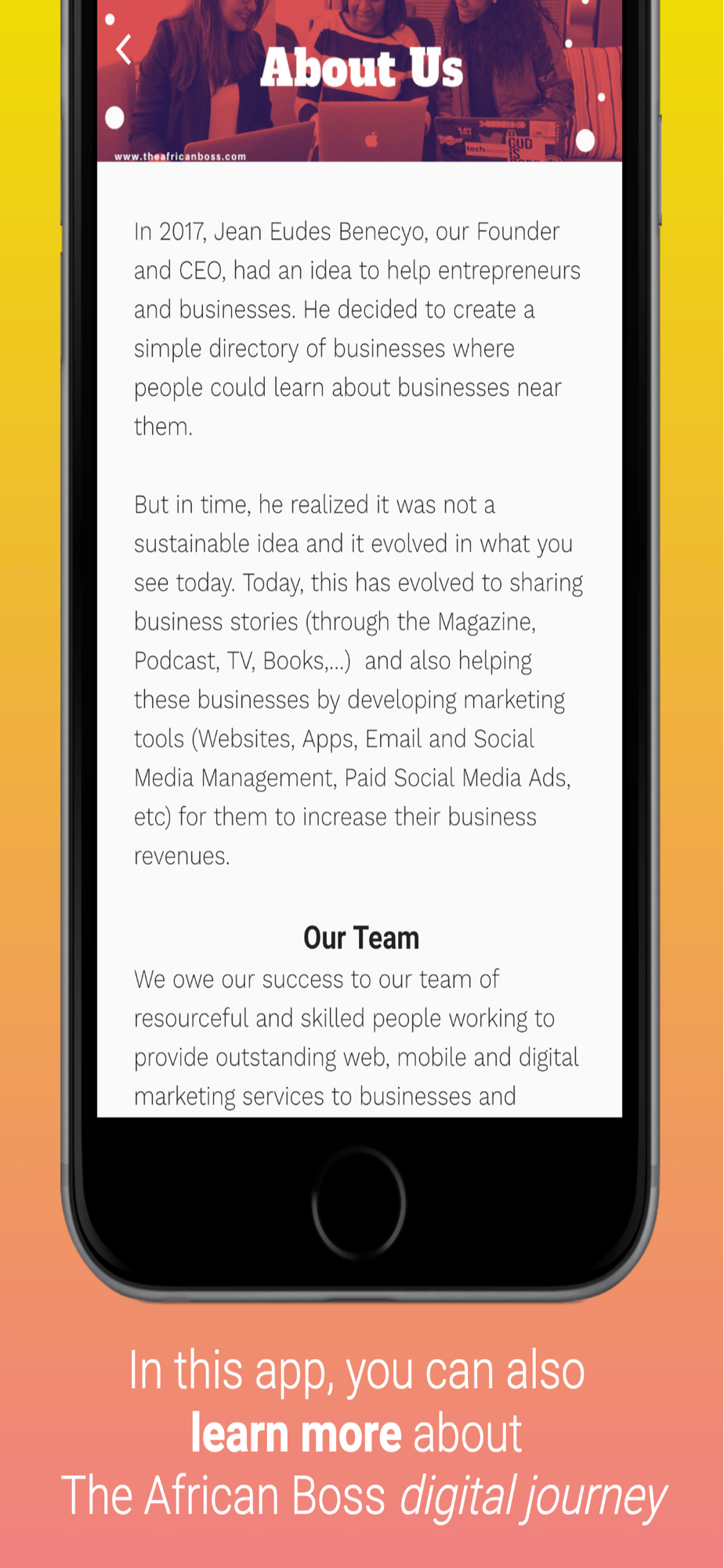 In 2017, Jean Eudes Benecyo, our Founder and CEO, had an idea to help entrepreneurs and businesses. He decided to create a simple directory of businesses where people could learn about businesses near them. But in time, he realized it was not a great idea and it evolved in what you see today. Today, it has evolved to sharing business stories (through the Magazine, Podcast, TV, Books,…) and also equipping businesses with affordable quality digital and marketing tools (Websites, and Apps) that help these businesses with a better online presence.