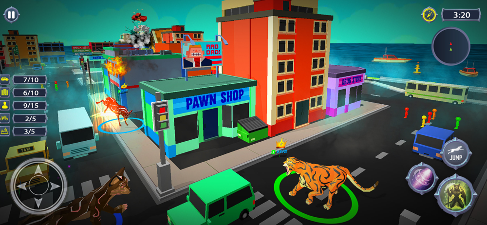 ¡Los tigres han resucitado hasta nuestros días! Control simple con solo deslizar. Mueve al tigre salvaje con un golpe para destruir la ciudad. Si un león de mayor nivel te ataca, solo ruge, no ataques y regresa para aturdir a la ciudad. Aplasta y aplasta vehículos con un extraordinario Monster Tiger Challenge.