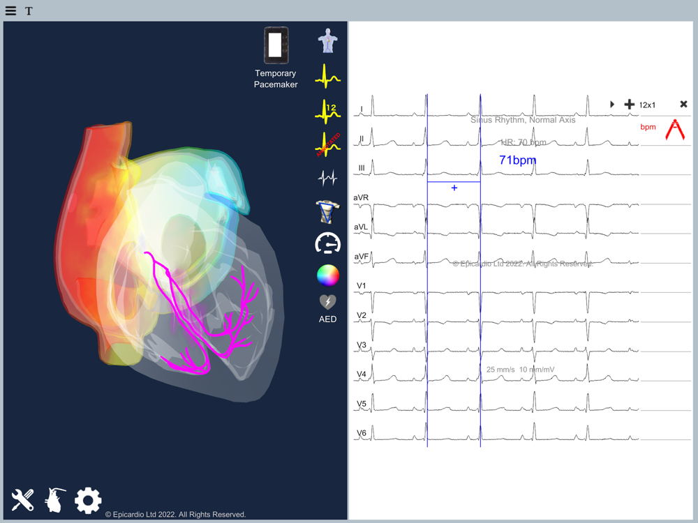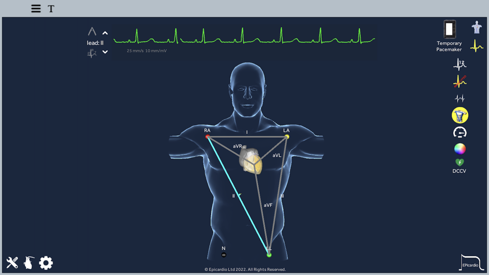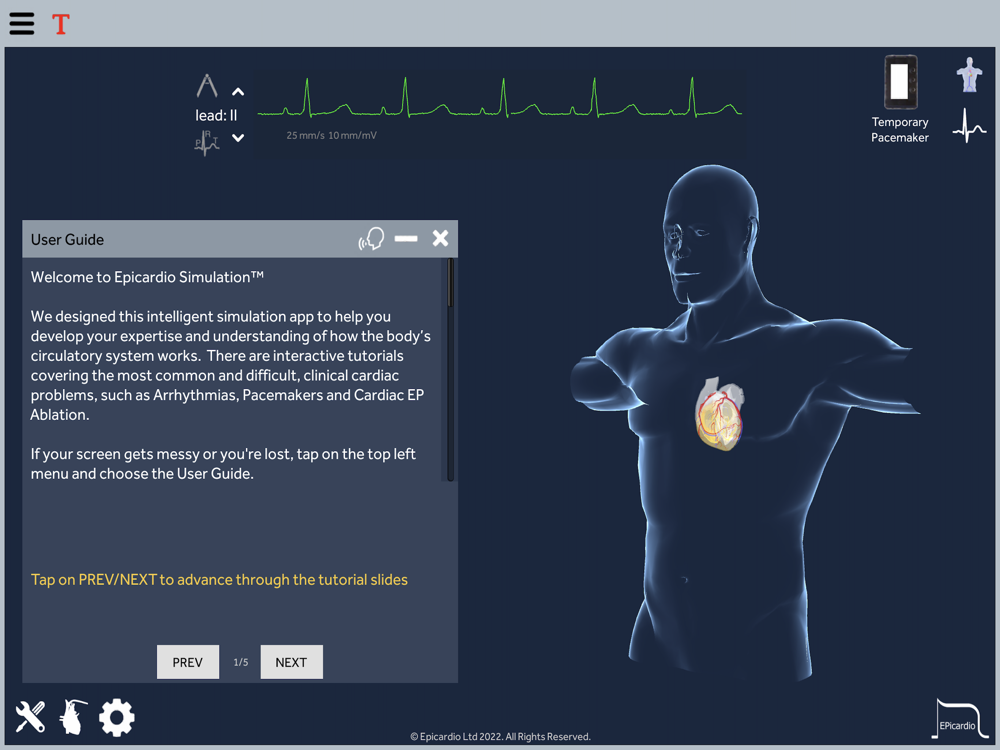 ECG is one of the most common diagnostics for Cardiology that all medical and nursing students are introduced at an early stage of their training. Confidence and experience gained from simulated training can help make first diagnosis successful and decrease risk to patients. This app uses real-time 3D anatomy and control of physiological parameters. Utilises electrophysiology simulation and live ECG signals to simulate the normal heart rhythm.