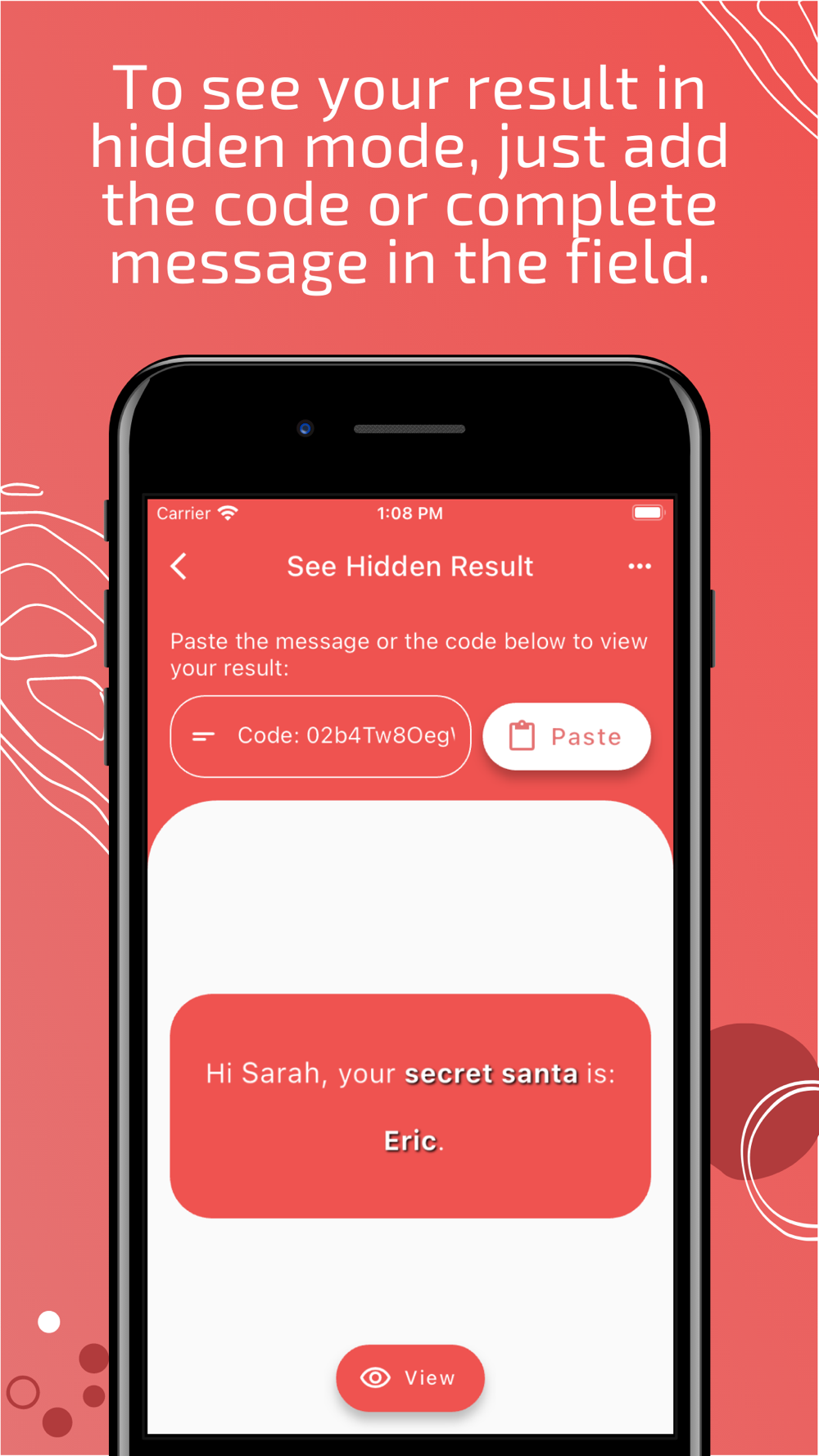 Para ver el resultado recibido en modo oculto, haga clic en la opción de menú "Ver Resultado Oculto" en la pantalla principal y agregue el código recibido o el mensaje completo para ver quién es su amigo invisible.