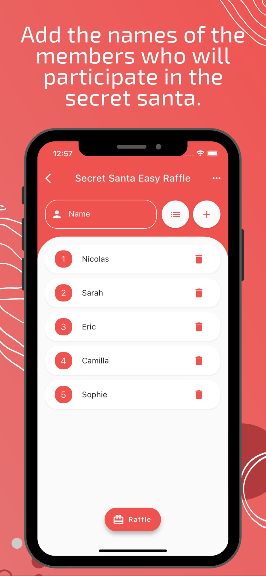 Añade los nombres de los participantes en la app y esta se encargará de realizar el sorteo para mostrar el resultado de cada miembro del amigo oculto de navidad.