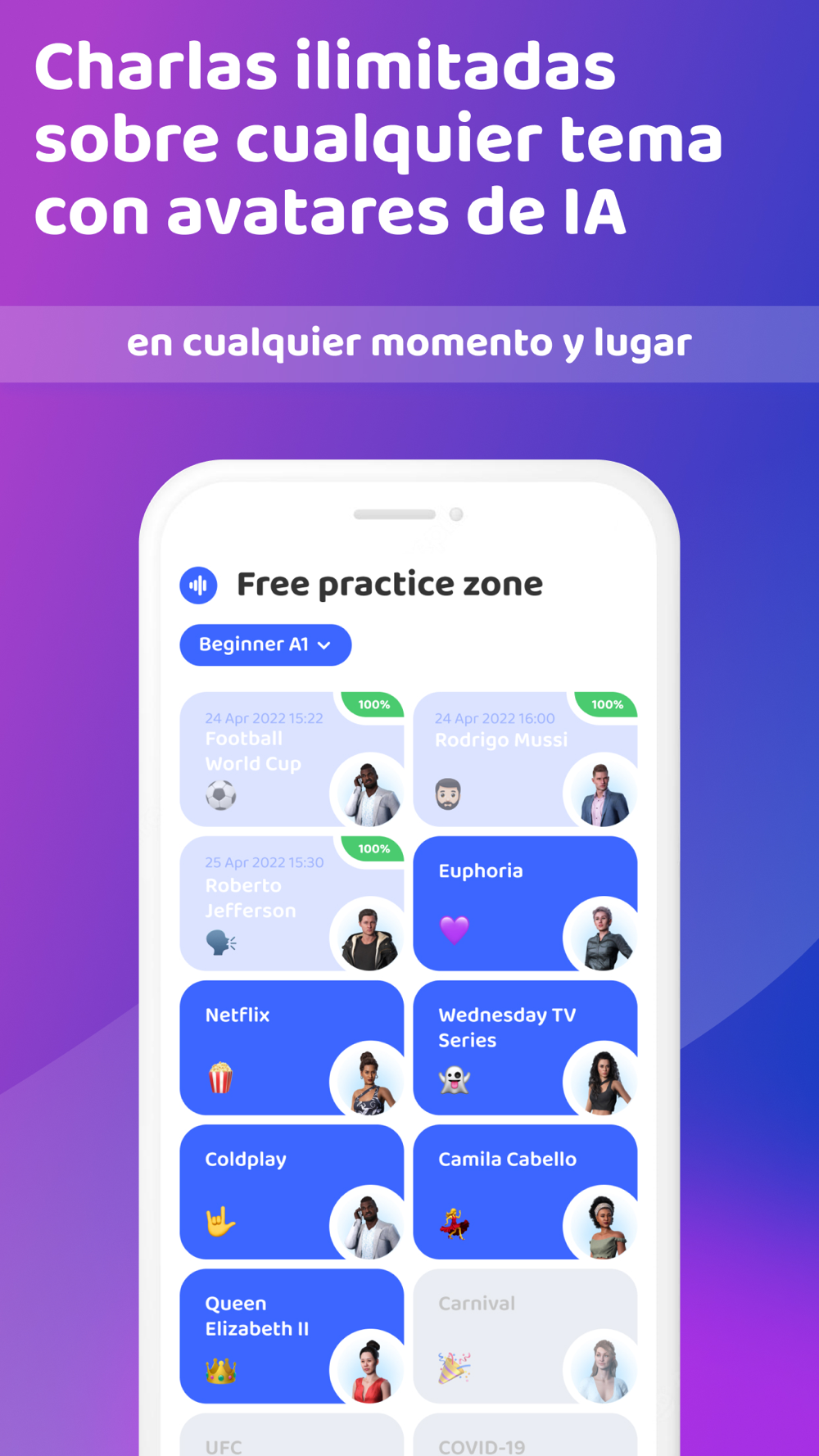 3. Temas prácticos: Explora más de 150 temas de práctica, desde el crecimiento económico y la asistencia sanitaria hasta el juego de roles como comentarista deportivo o ejecutivo de marketing.