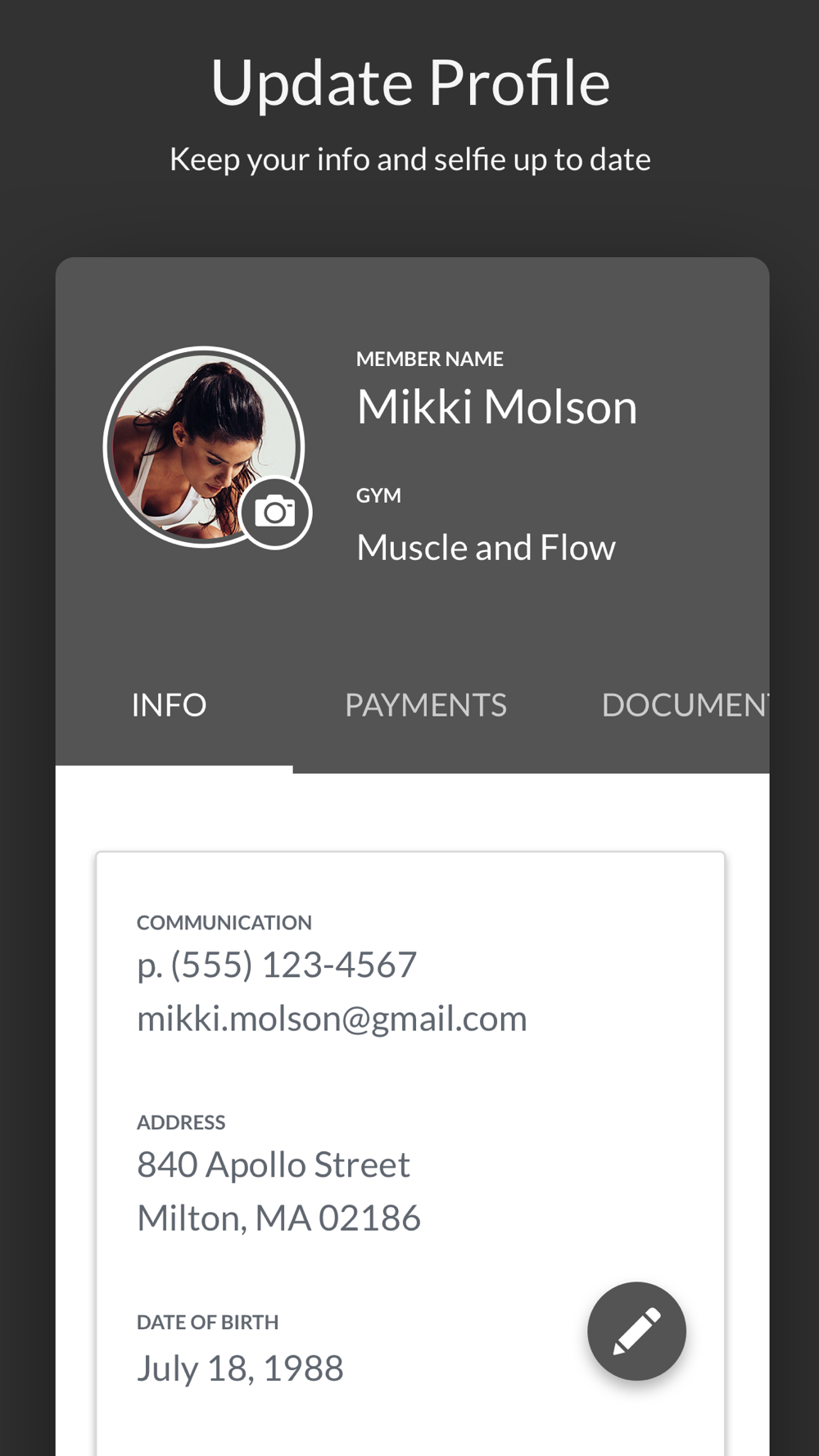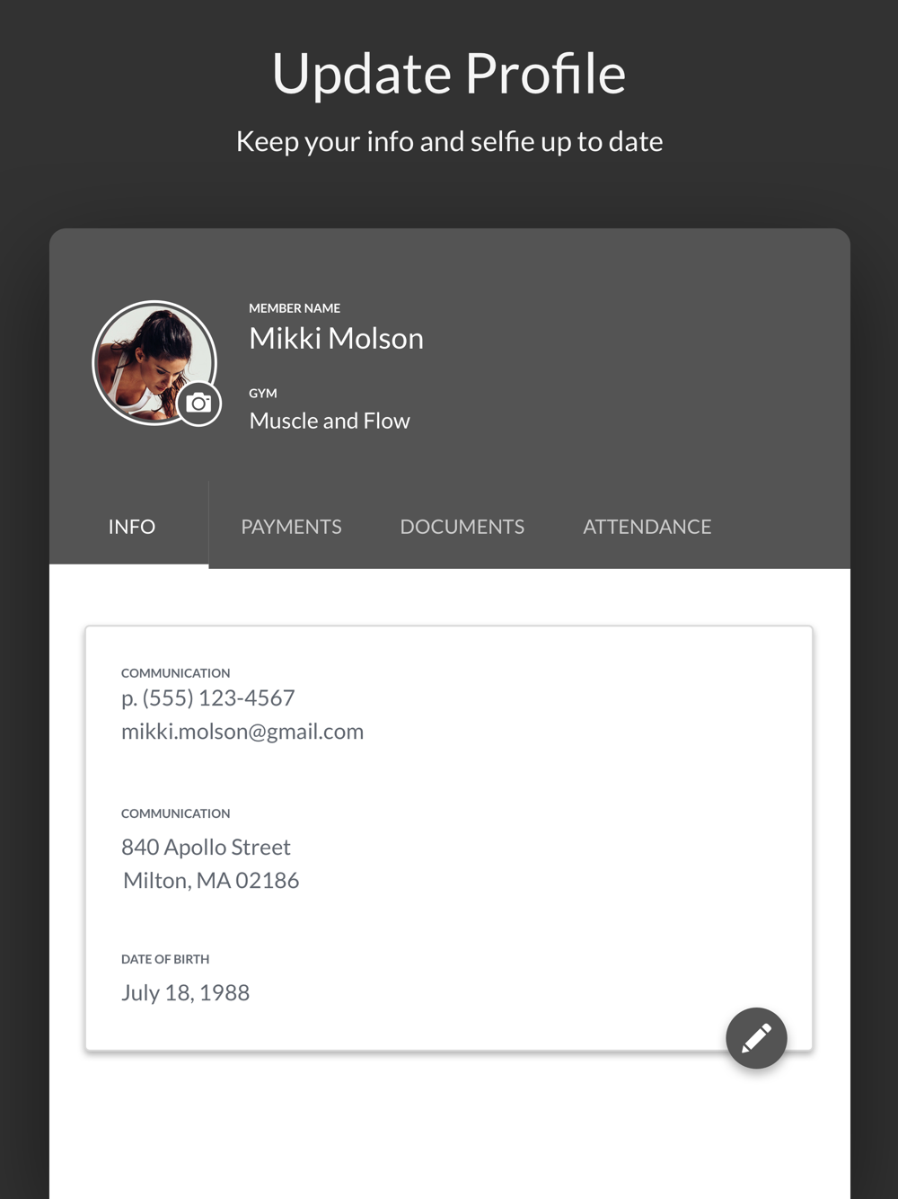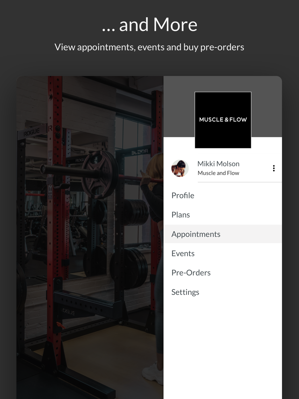 For members of Muscle and Flow to reserve their place in a class, sign up for gym events, and general account management like updating headshots and credit card on file.