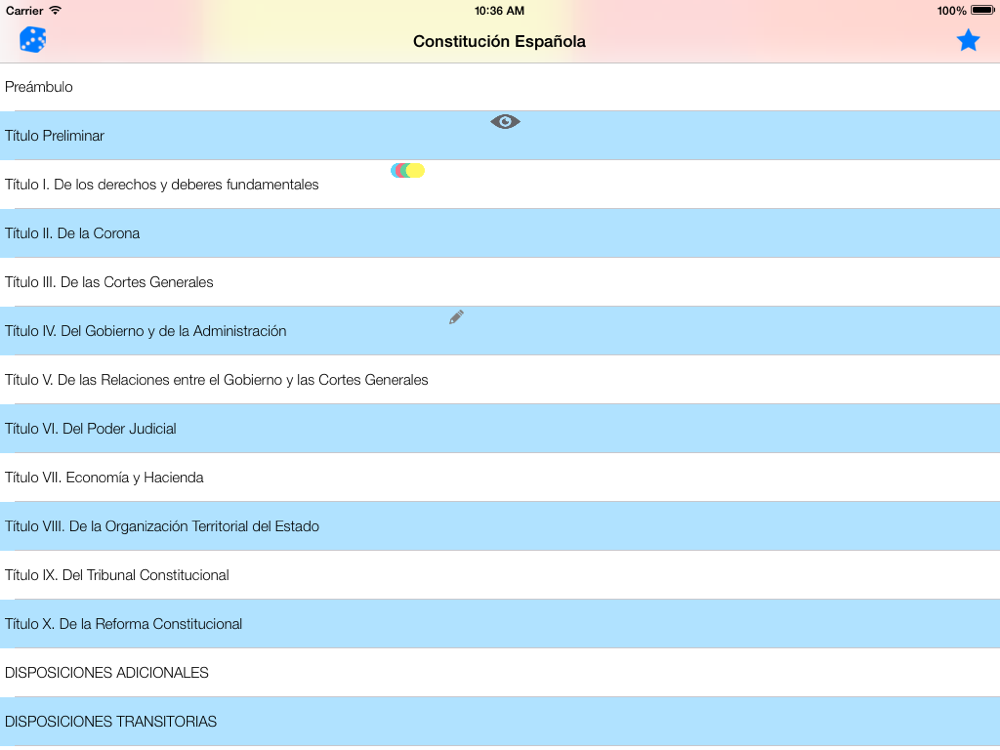 En la versión de la Constitución para el iPhone puede: correo electrónico con los títulos de la Constitución, editar y crear notas, añadir títulos a los Favoritos, controlar el tamaño de la fuente.