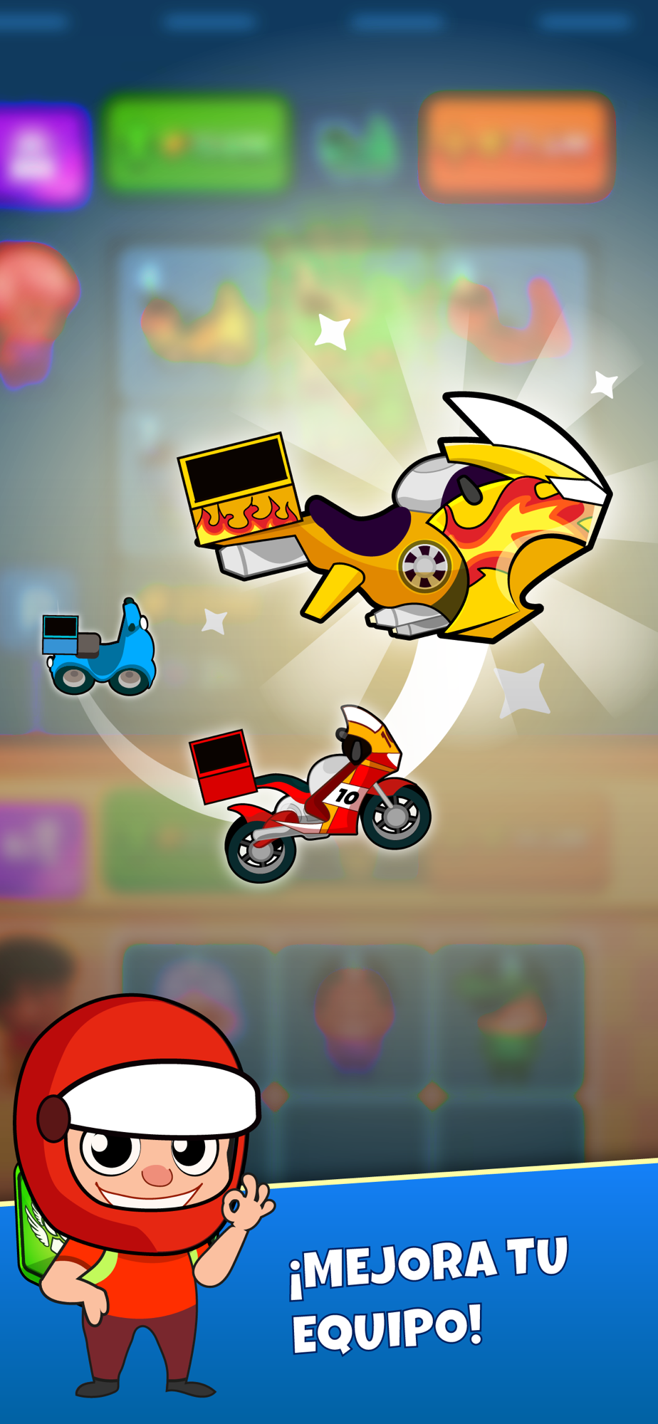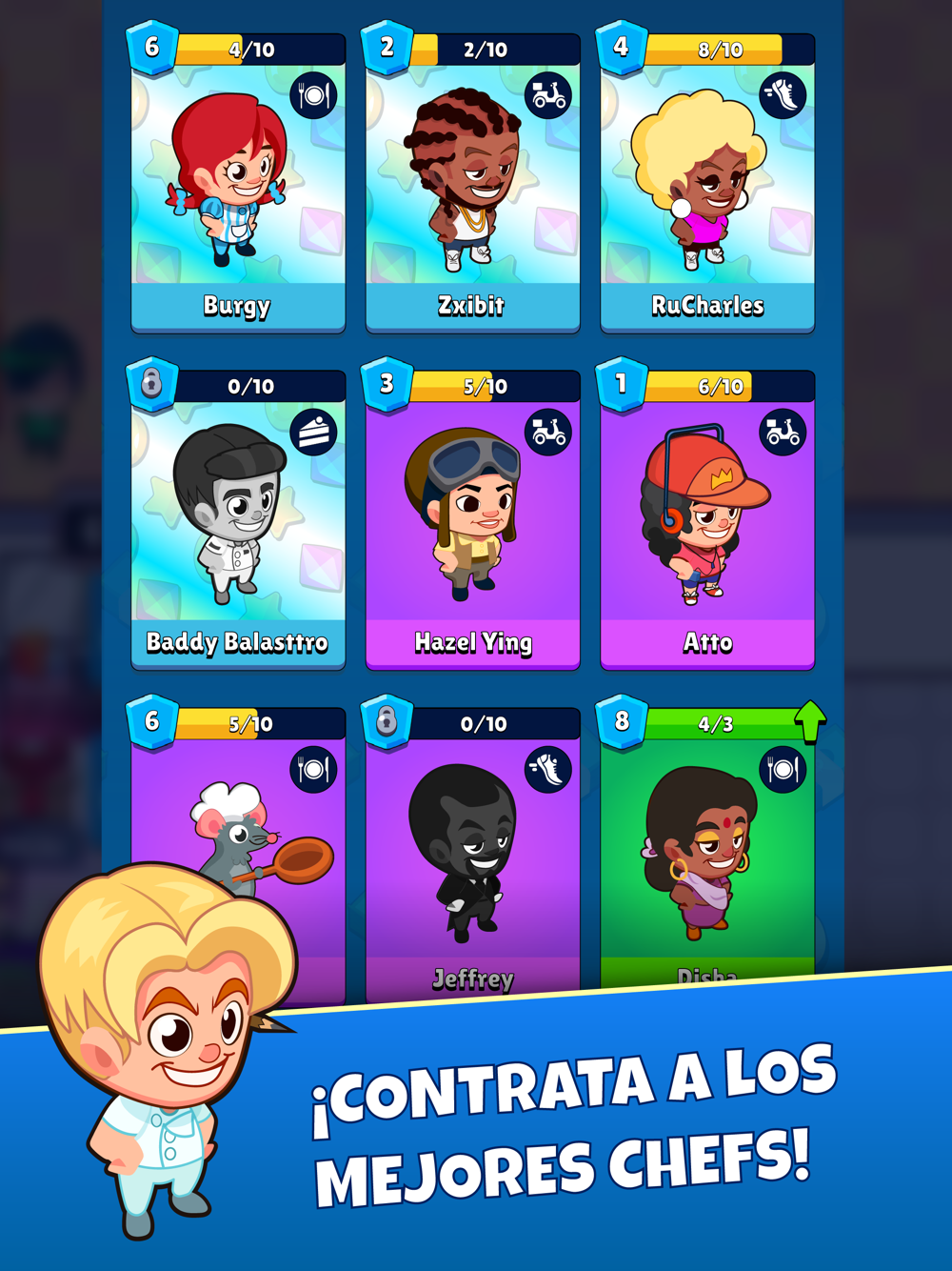 - Haz merge a los ingredientes de tus platillos, a tu personal y a las motos de delivery para aumentar la velocidad y los beneficios.