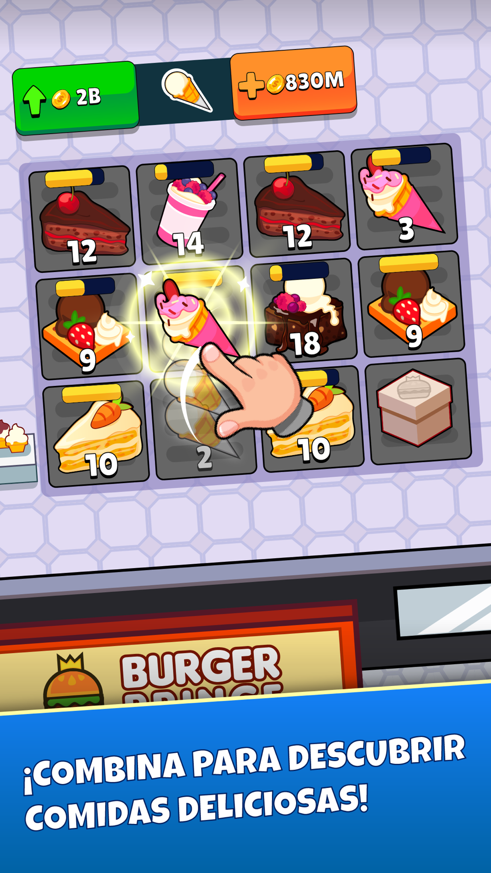 El único juego en el que puedes construir un imperio tycoon haciendo merge a la comida rápida en esta aventura de simulador.