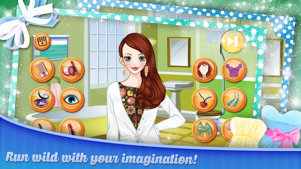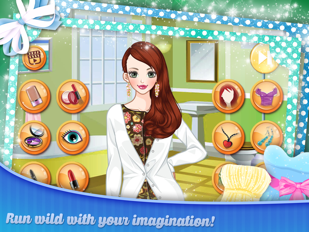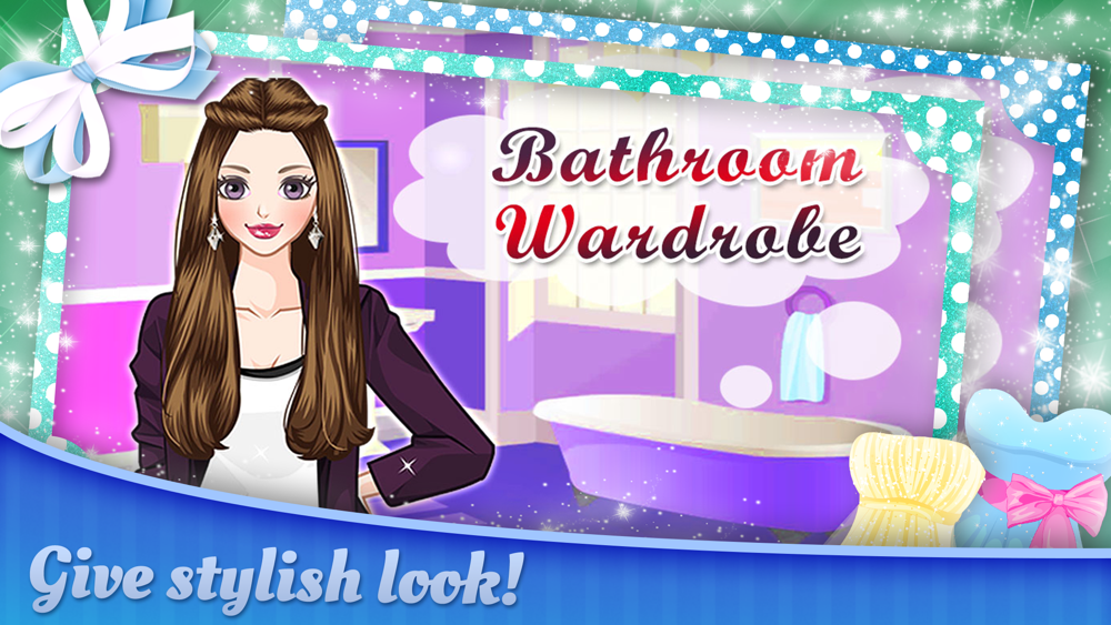 Do you love changing clothes? Pick and try new outfit in your bathroom. Choose hairstyle, select dress and blouse, add accessories. Apply make-up on your face, choose lipstick, mascara, eye lashes and skin color. Be a true princess!