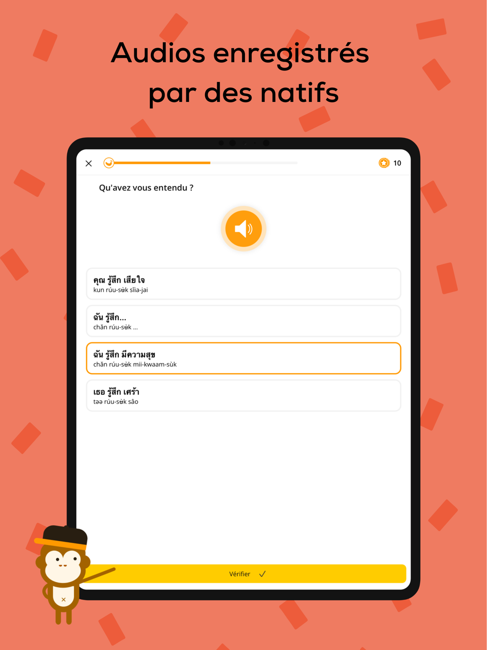 - Écouter et répèter les expressions lues par des locuteurs natifs thaïlandais.