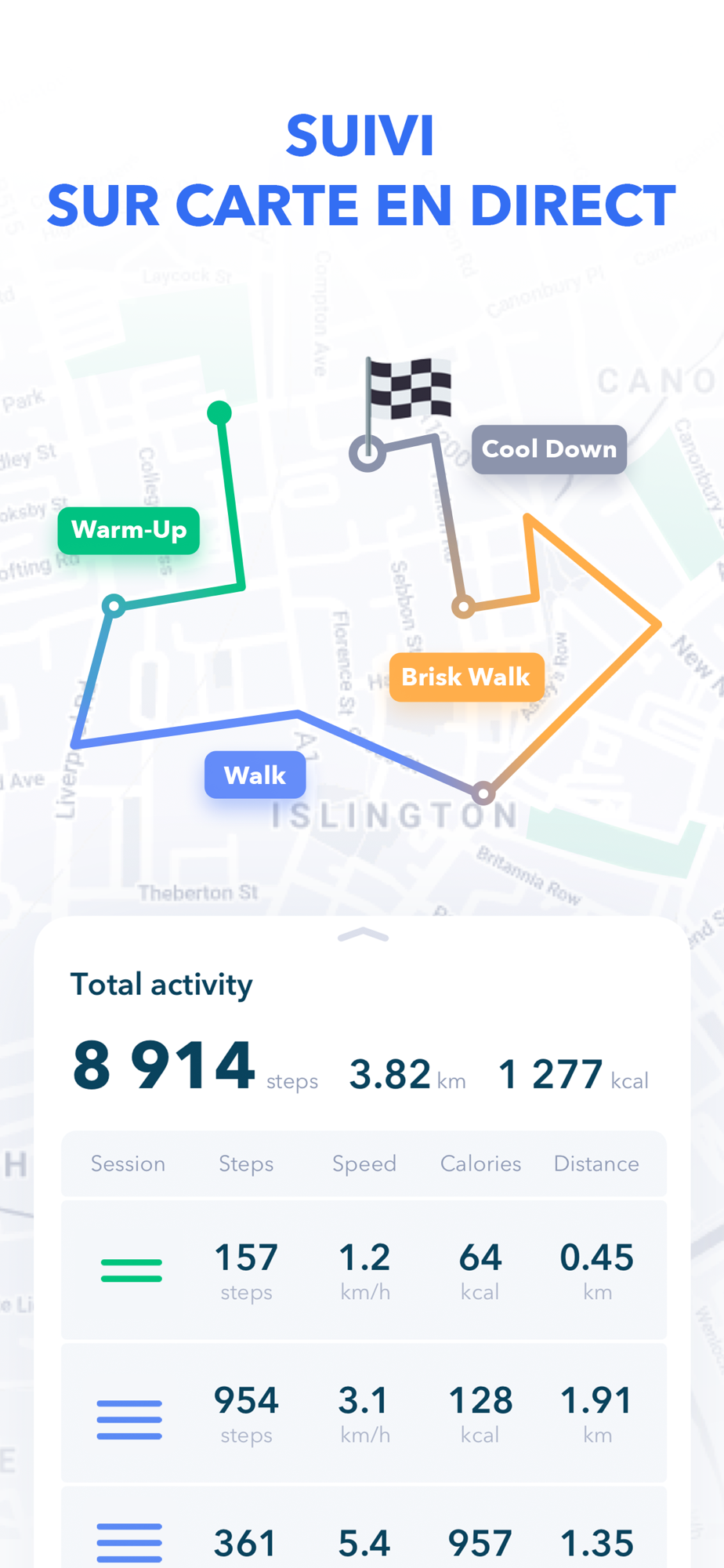 • Et avec le suivi avancé des progrès, vous ne perdrez jamais de vue ce que vous voulez réaliser. Chaque pas que vous ferez, chaque calorie que vous perdrez pour vous rapprocher d'objectifs plus ambitieux seront précisément mesurés, calculés et enregistrés dans vos statistiques de progression.