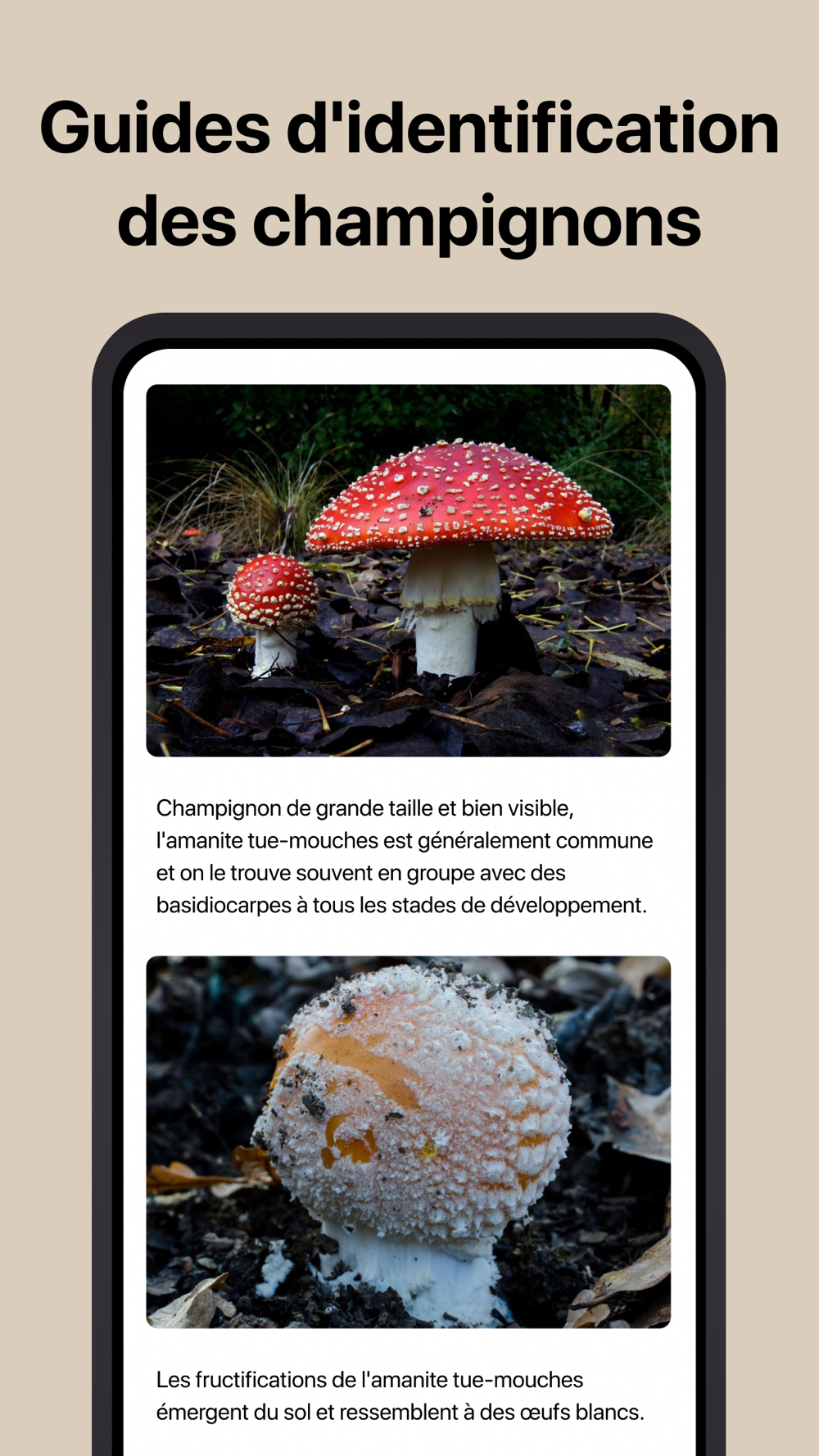 - Gardez facilement la trace des champignons que vous avez identifiés dans votre collection, et partagez vos découvertes avec vos amis.