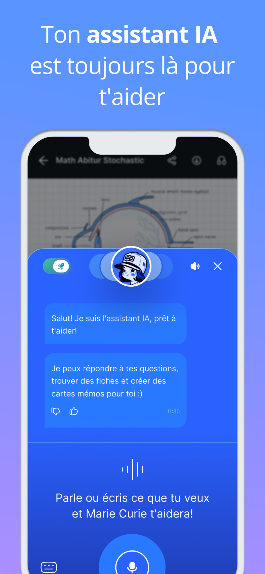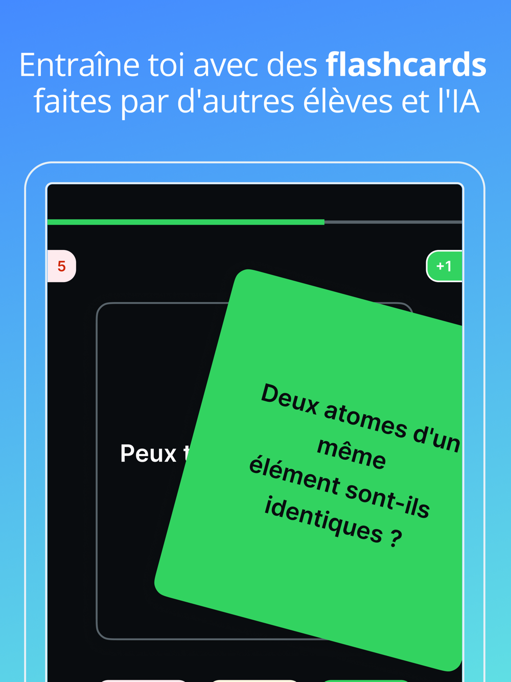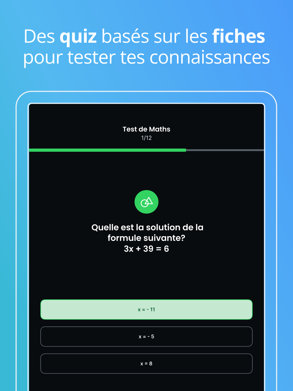 Tu ne sais même pas par où commencer pour réviser ton interro de maths ? Il te suffit d'indiquer la matière et tu trouveras plein de cartes mémos et quizz pour t’entraîner. Tu n’es toujours pas sûr.e ? Demande dans un groupe de révisions ou à l'IA de te donner des conseils.