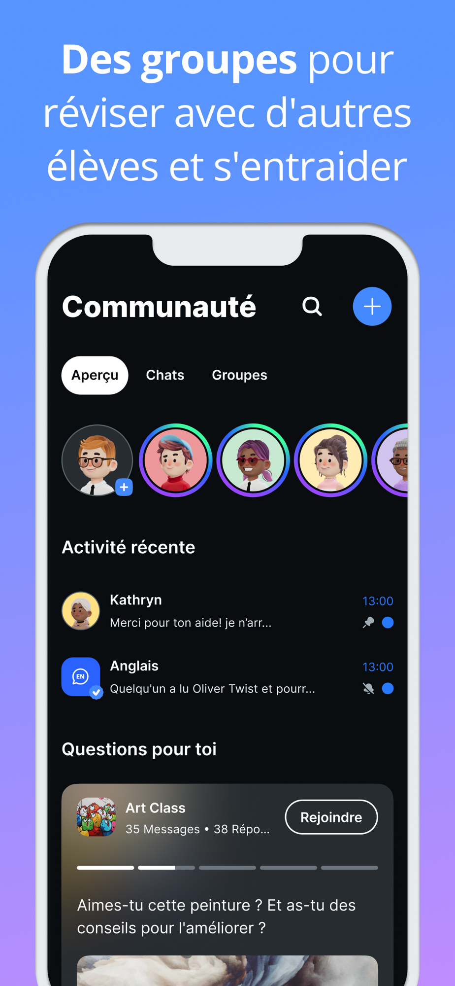 On est tous dans le même bateau, alors pourquoi ne pas s’entraider? Sur Knowunity, tu peux rejoindre des milliers d’élèves sur des groupes de révision pour tes matières à problème. Tu peux te confier sur ce qui te stresse à l’école, échanger des conseils, ou encore créer un groupe de révision et construire ta propre communauté.