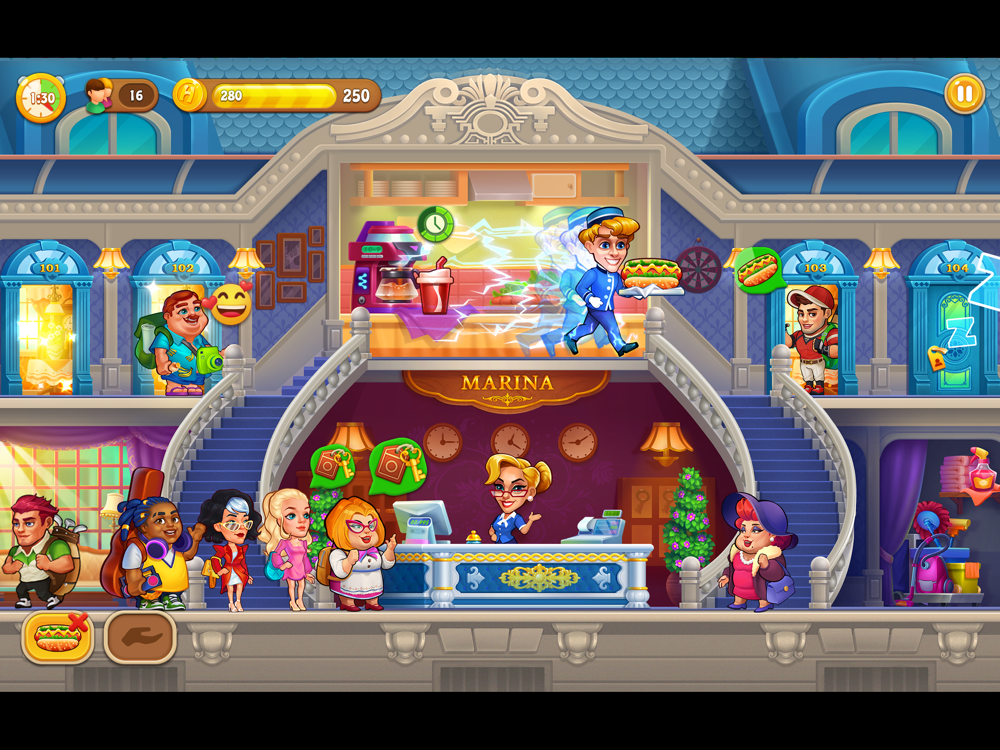 - Gagnez des pièces et des pierres précieuses pour améliorer les services de l’hôtel : ustensiles de cuisine, services de salle de nettoyage…