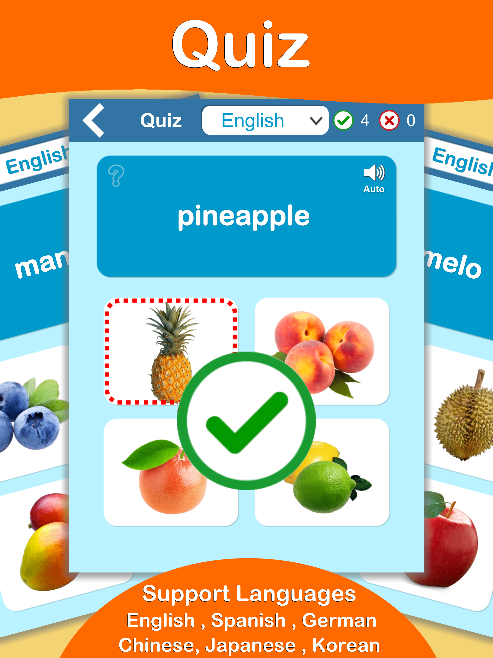 The app helps you to easy learning many kinds of Fruits from the cards and know their names in several languages.