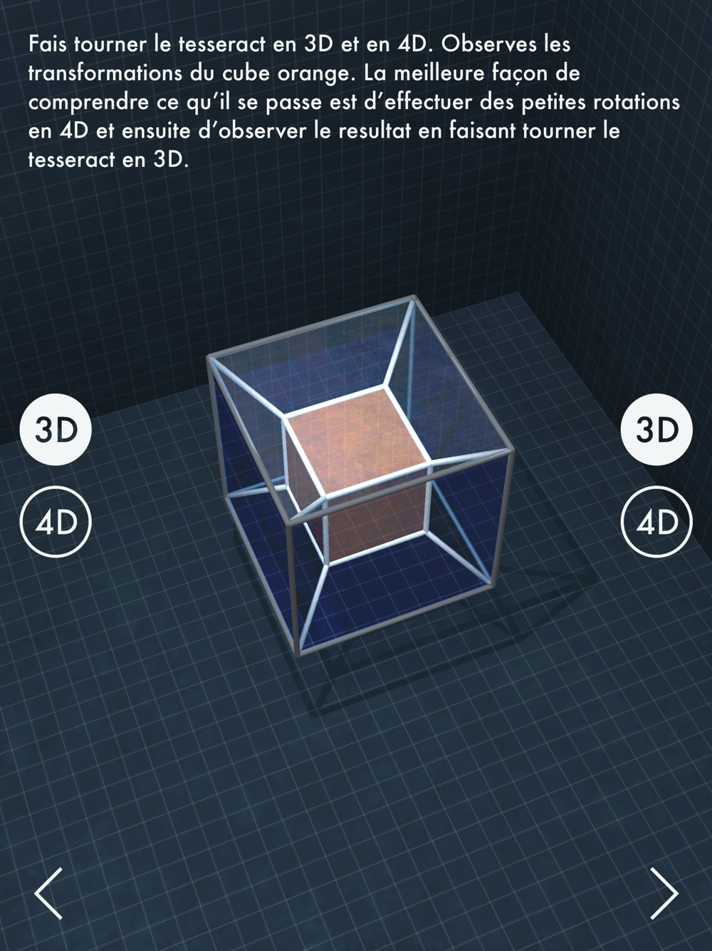 La quatrième dimension est un livre interactif de 30 pages qui explique une seule idée mathématique dans un langage accessible à tout le monde. Au lieu d'utiliser des images statiques ou des vidéos toutes faites, cette application dispose d'une unique interface tactile en 3D qui vous permet de comprendre littéralement le concept de la quatrième dimension de vos propres mains.