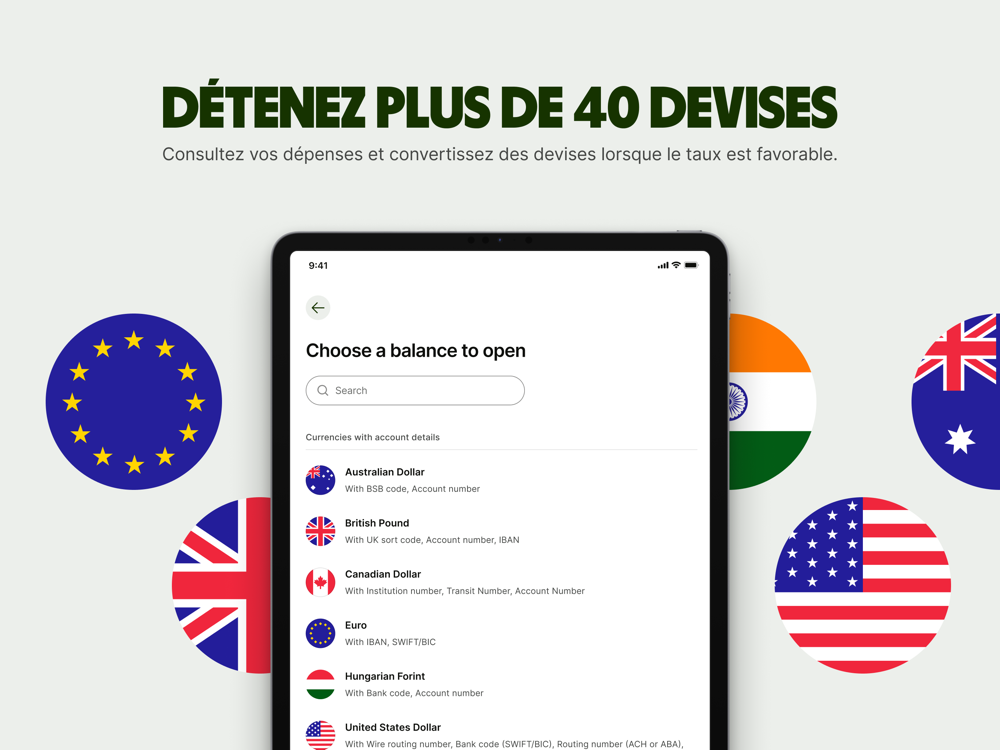 • Obtenez votre propre numéro de compte et sort code britanniques, IBAN européen, numéros de compte et de routage aux États-Unis et plus encore. Comme si vous aviez des comptes bancaires locaux à travers le monde.
