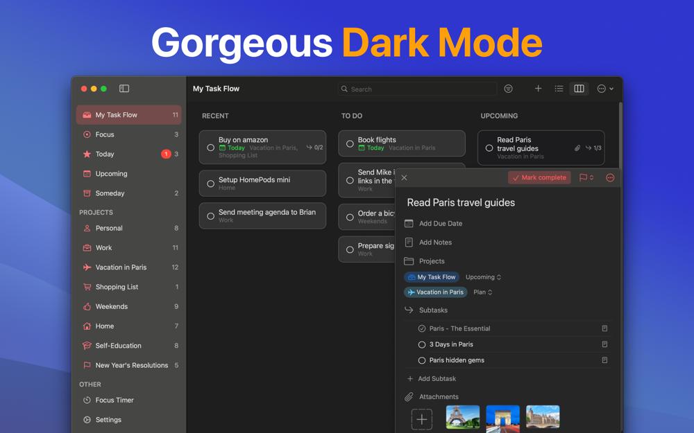 - Comprehensive Task Details: Enhance each task with subtasks, priorities, notes, and attachments for a detailed, organized approach. Highlight critical tasks within a project with elevated priorities.