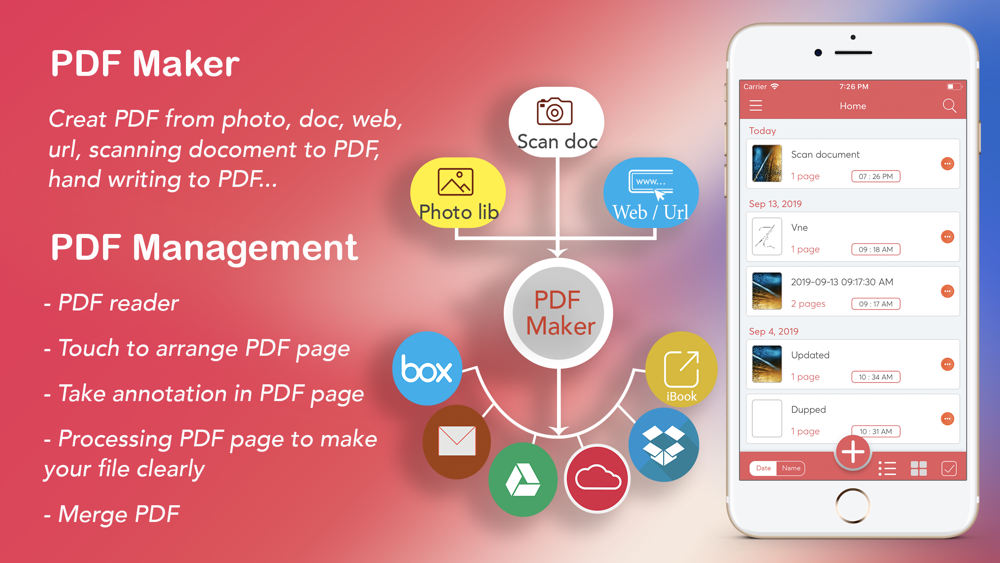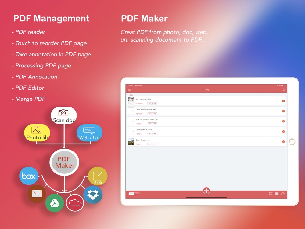 PDF Maker help you to create new PDF file from Photos, Web, Scan documents then share via Email, Dropbox, iCloud, Dropbox, Google Drive, iBooks