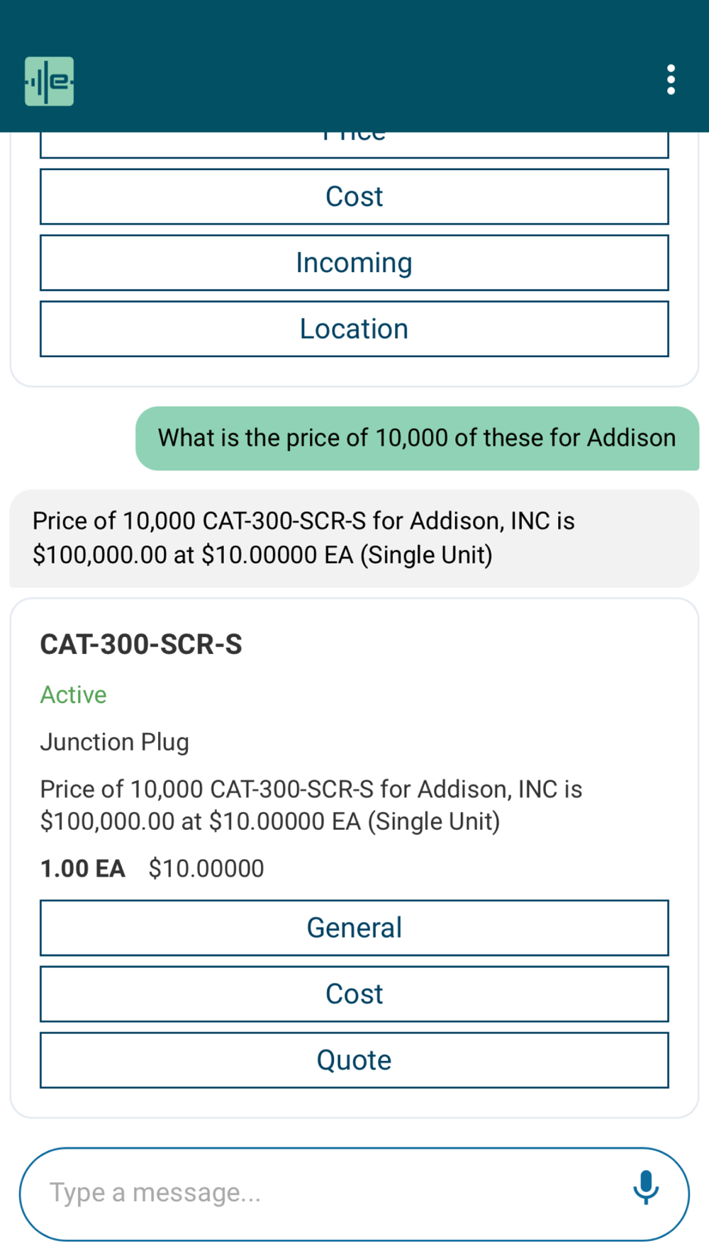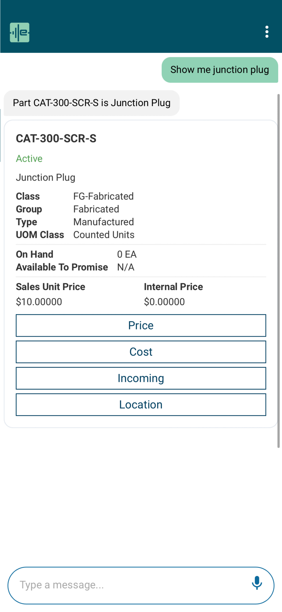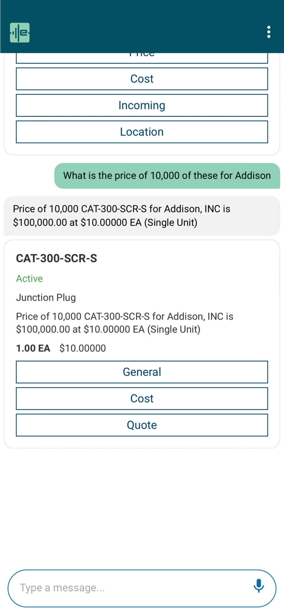 Epicor Virtual Agent (EVA) is intelligence personified for Epicor® ERP, Eclipse and Prophet 21® systems across industries. Users will be empowered by the context-aware natural language processing of EVA. Voice or text commands on your mobile device are a great time-saver—with the EVA app, you interact naturally with your ERP system. It is as easy as just talking or typing to a colleague. EVA also presents richly formatted information and guides the user by suggesting the next set of navigations and actions. This makes the breadth and depth of the industry-specific functionality and information available inside the system directly accessible to a larger audience, boosting productivity and efficiency, and giving your company an improved return on ERP investment.