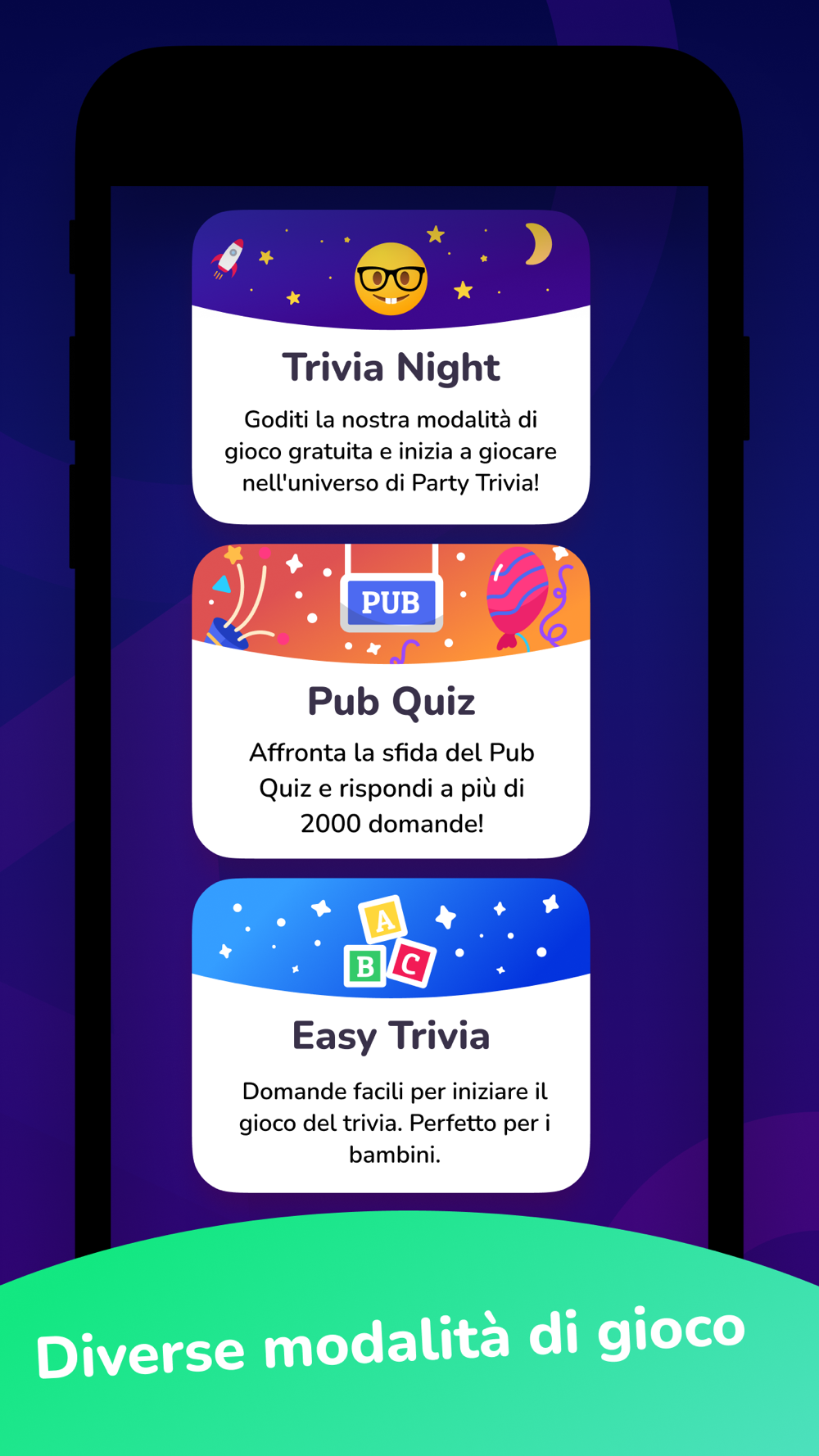 Per ogni risposta corretta, ottieni un punto. Facile. Ma rimane una domanda: Sarai in cima alla classifica? Scoprilo e scarica subito Party Trivia!