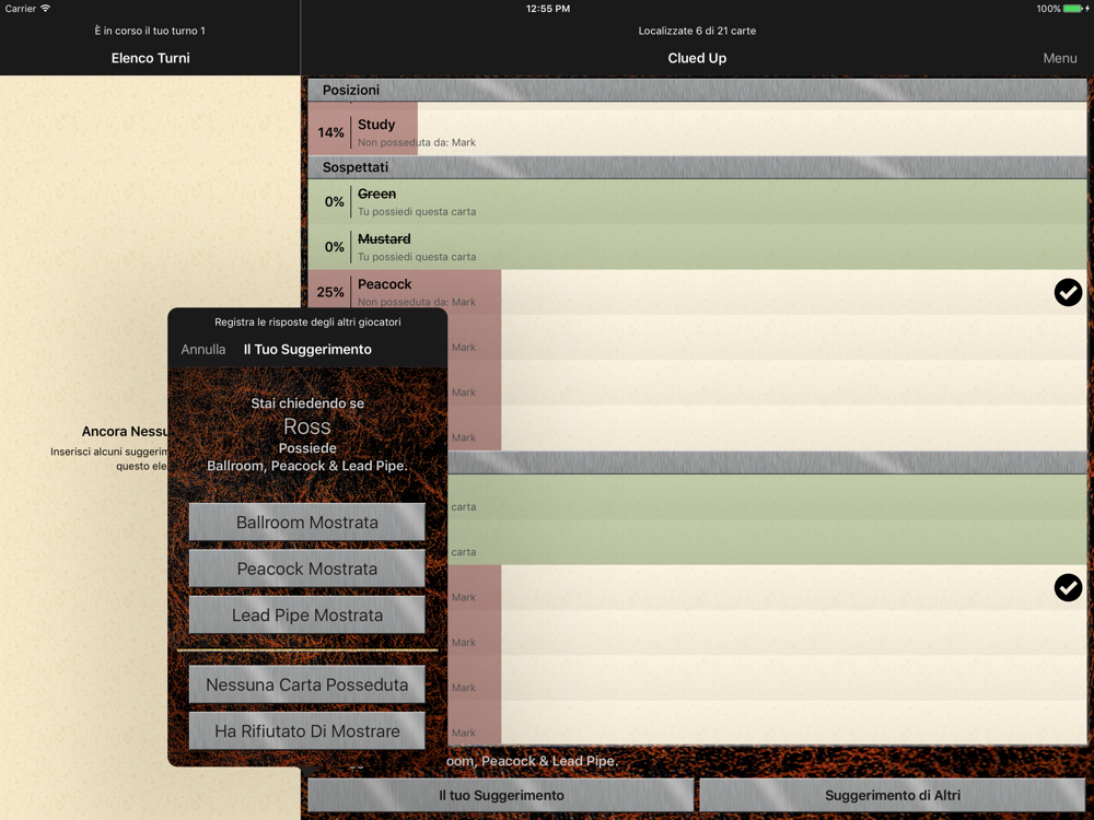 Se non vuoi dare alcuna possibilità ai tuoi avversari, Clued Up ti offre molto più di una pratica scheda punteggi. Se abiliti le deduzioni automatiche, l'app studierà i riferimenti di tutti i turni di gioco e localizzerà le carte per te, andando ben oltre ciò che un essere umano potrebbe fare.