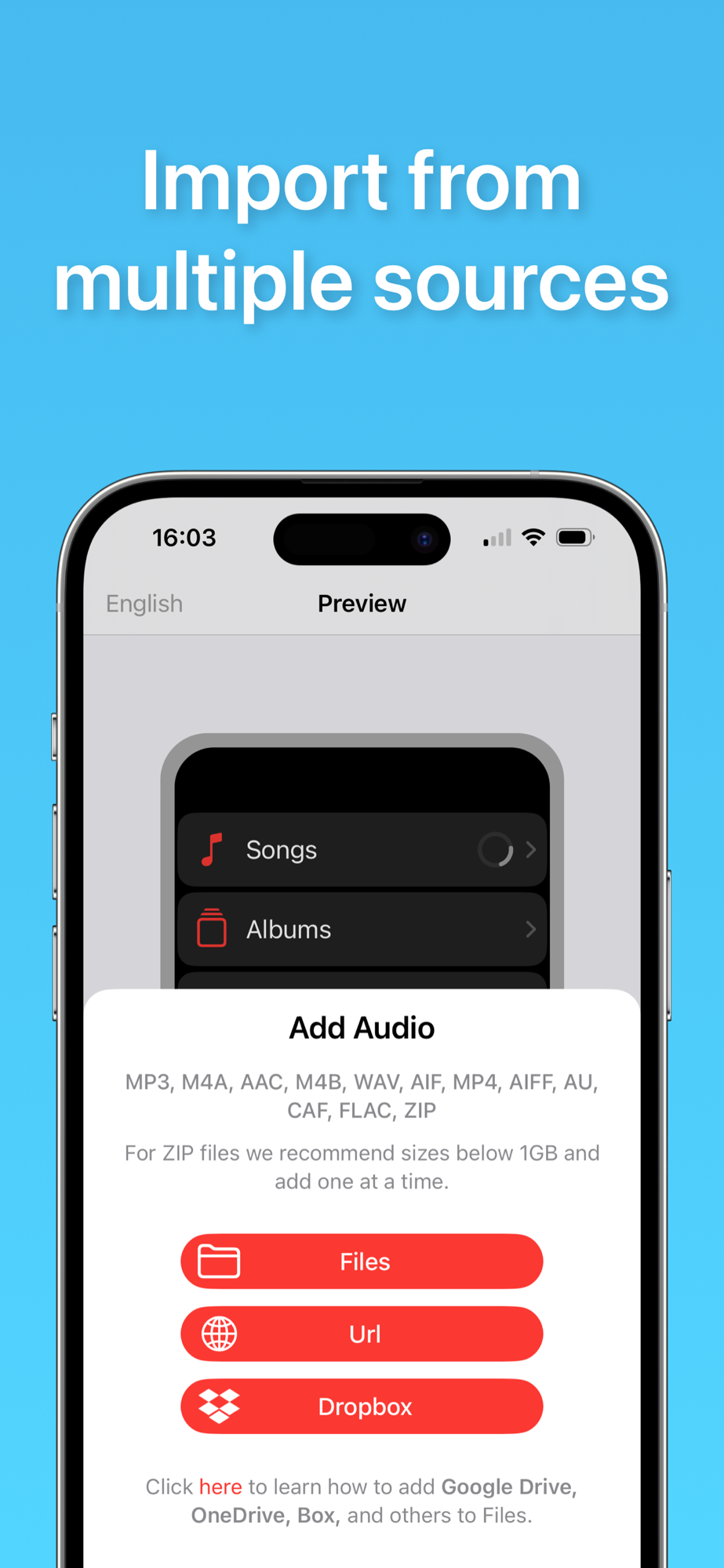 ● Import from Files, iCloud, Google Drive, Dropbox, & more