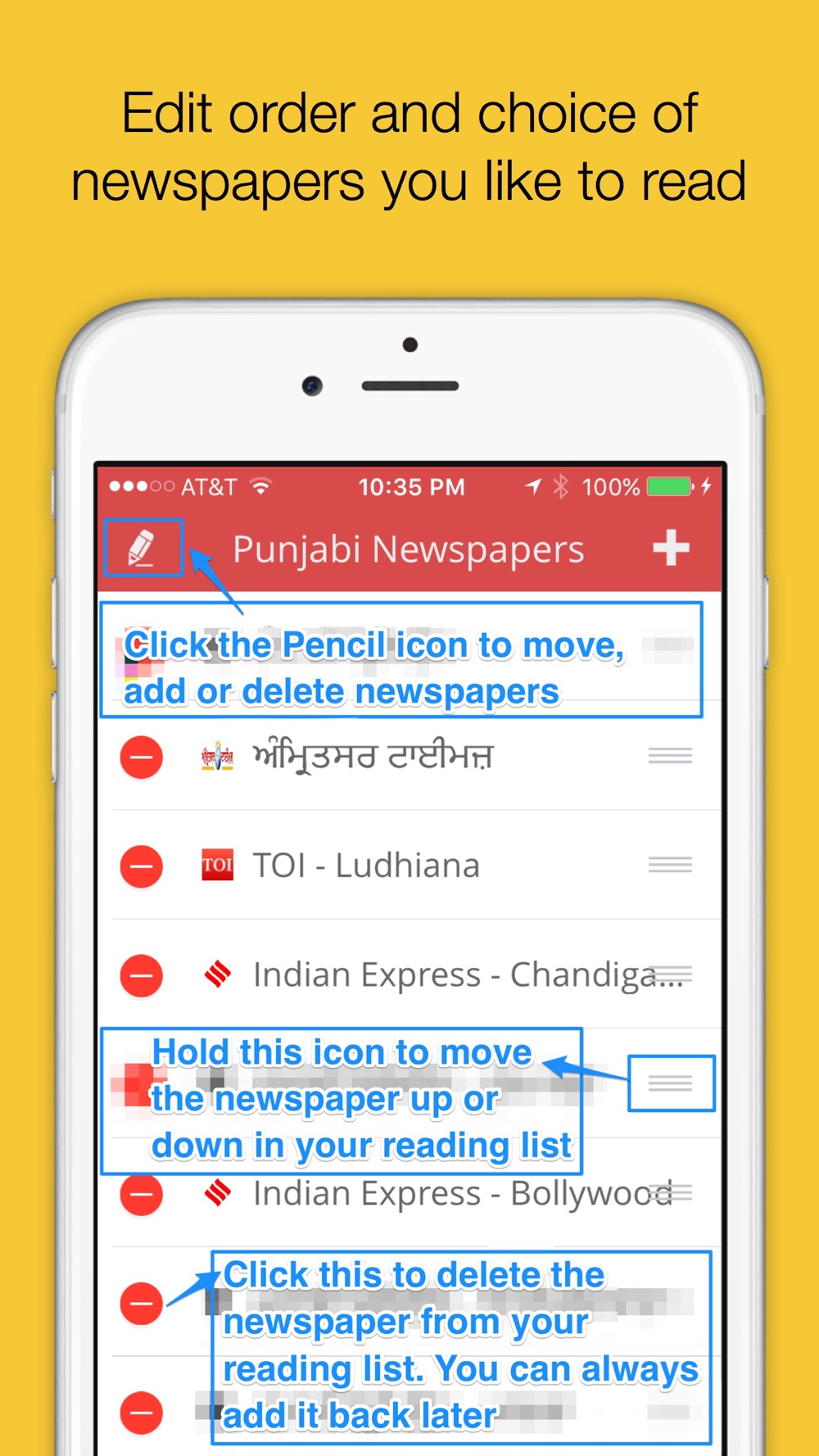 Edit the newspapers you like to read by clicking the pencil icon. Delete the newspapers you don't want, don't worry, you can always add them back.