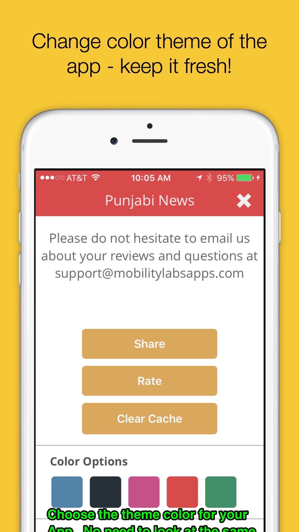 Never get tired of seeing the same color theme for your app. You can choose from 5 available color theme choices. Click the 'i' or information icon from the top navigation bar and choose the theme color of your choice.