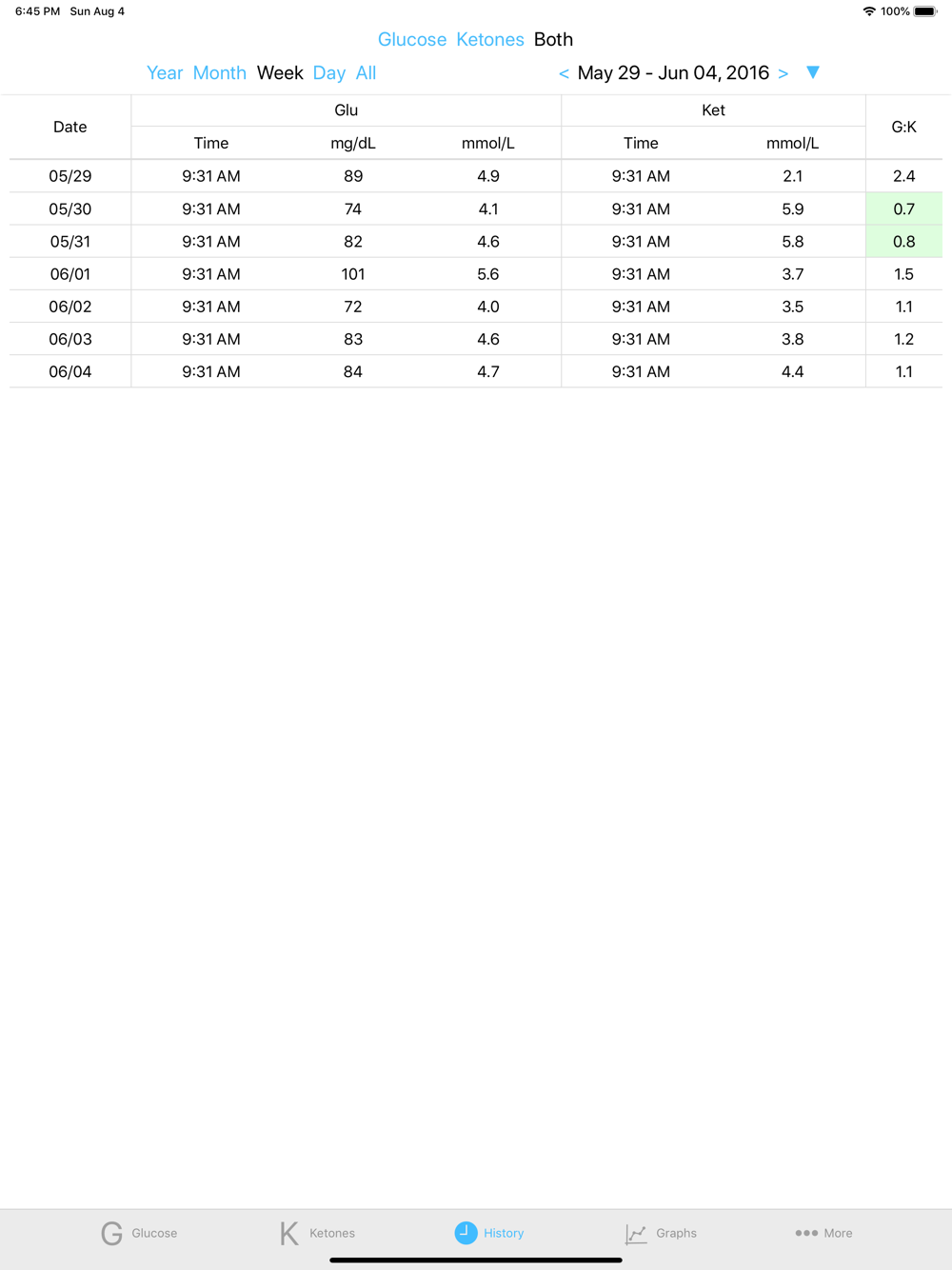The history view lets you see your readings. Either glucose, ketones or using a "Both" view. In the Both view matching glucose/ketones readings are paired and the GKI is calculated.