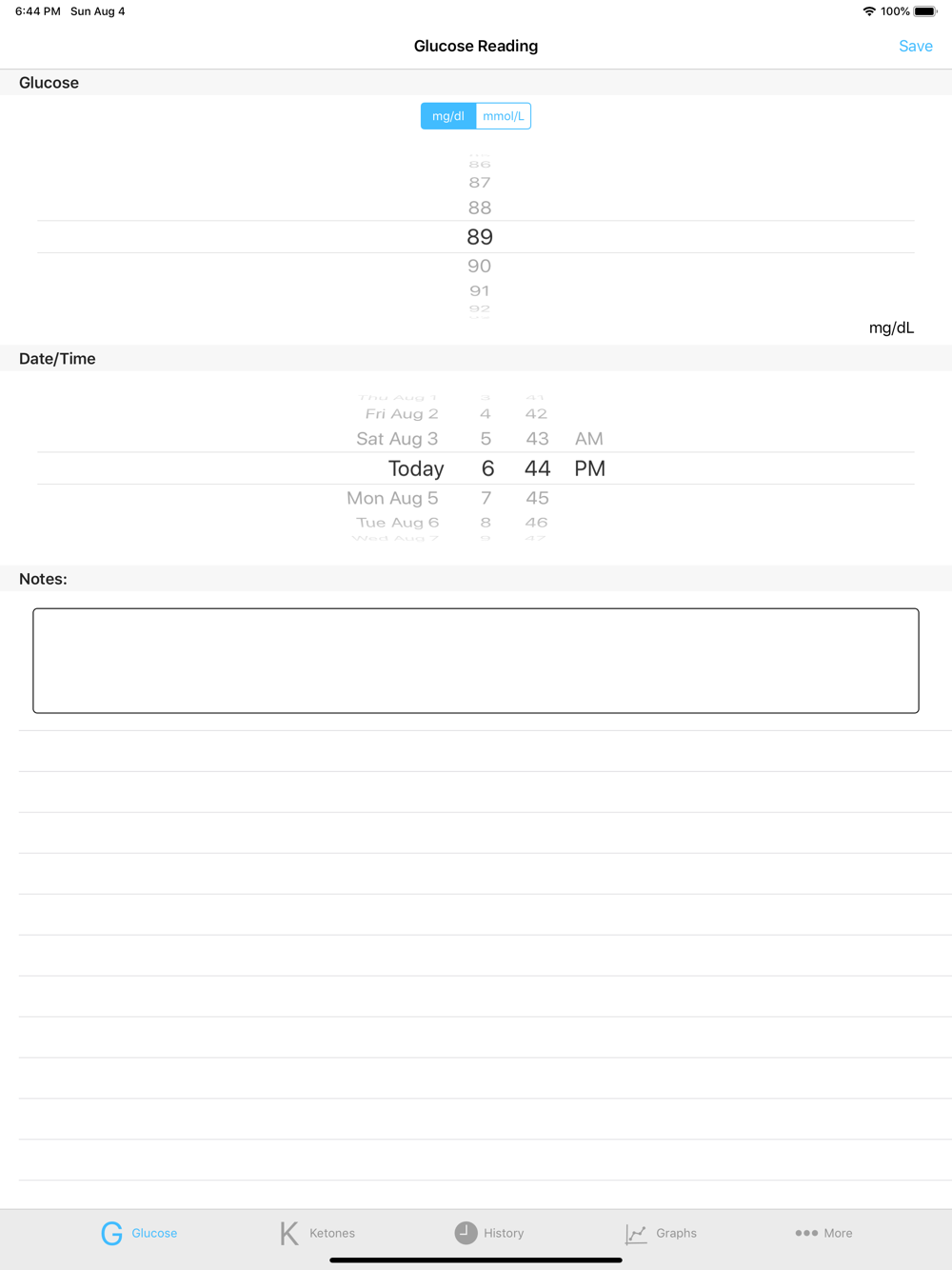 Enter your glucose and ketone readings with ease via the simple to use entry screens. Both mg/dL and mmol/L glucose units are supported.