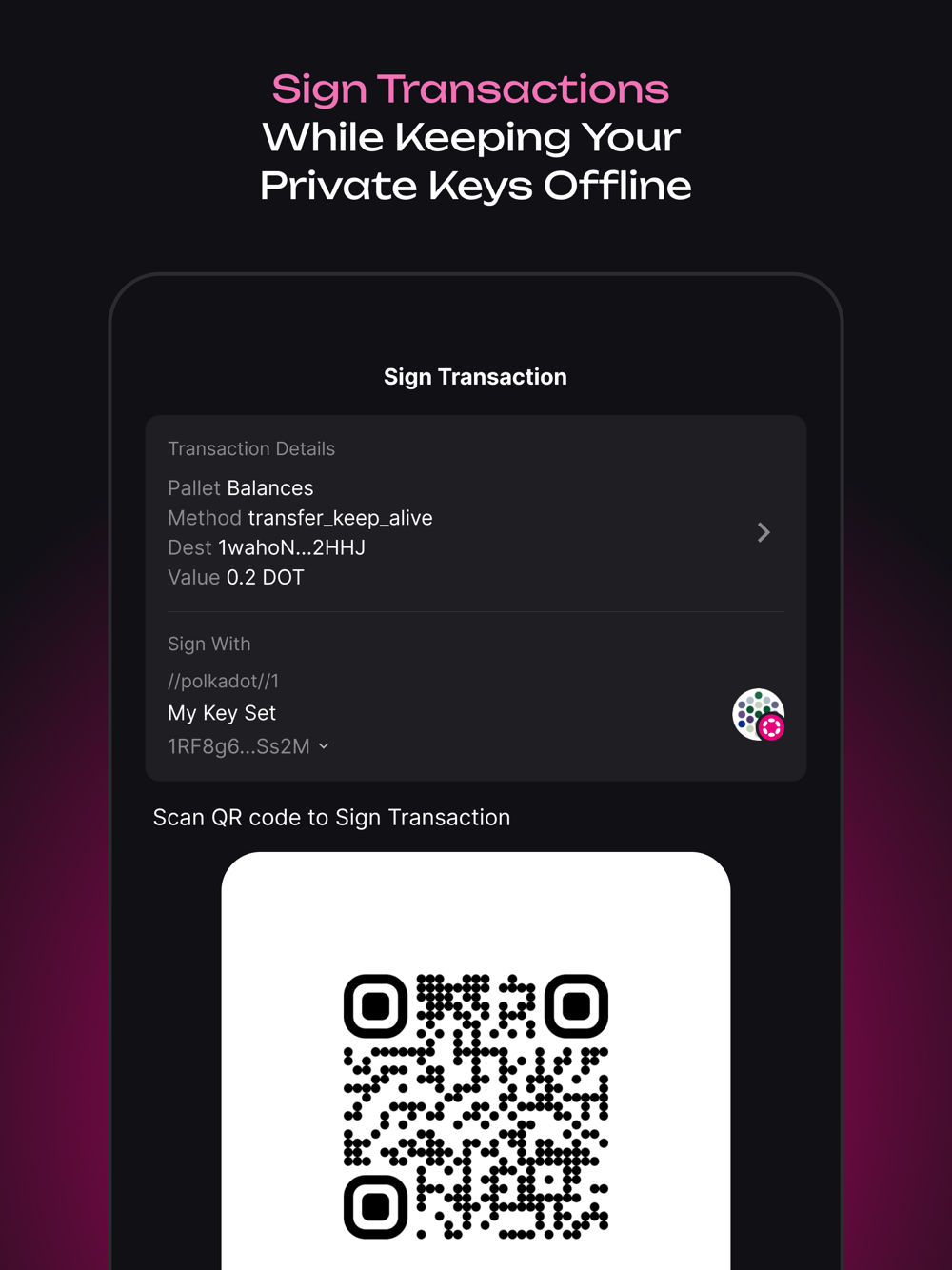 - Sign transactions directly on your device and execute them on your "hot device" by showing it back the signed QR code.