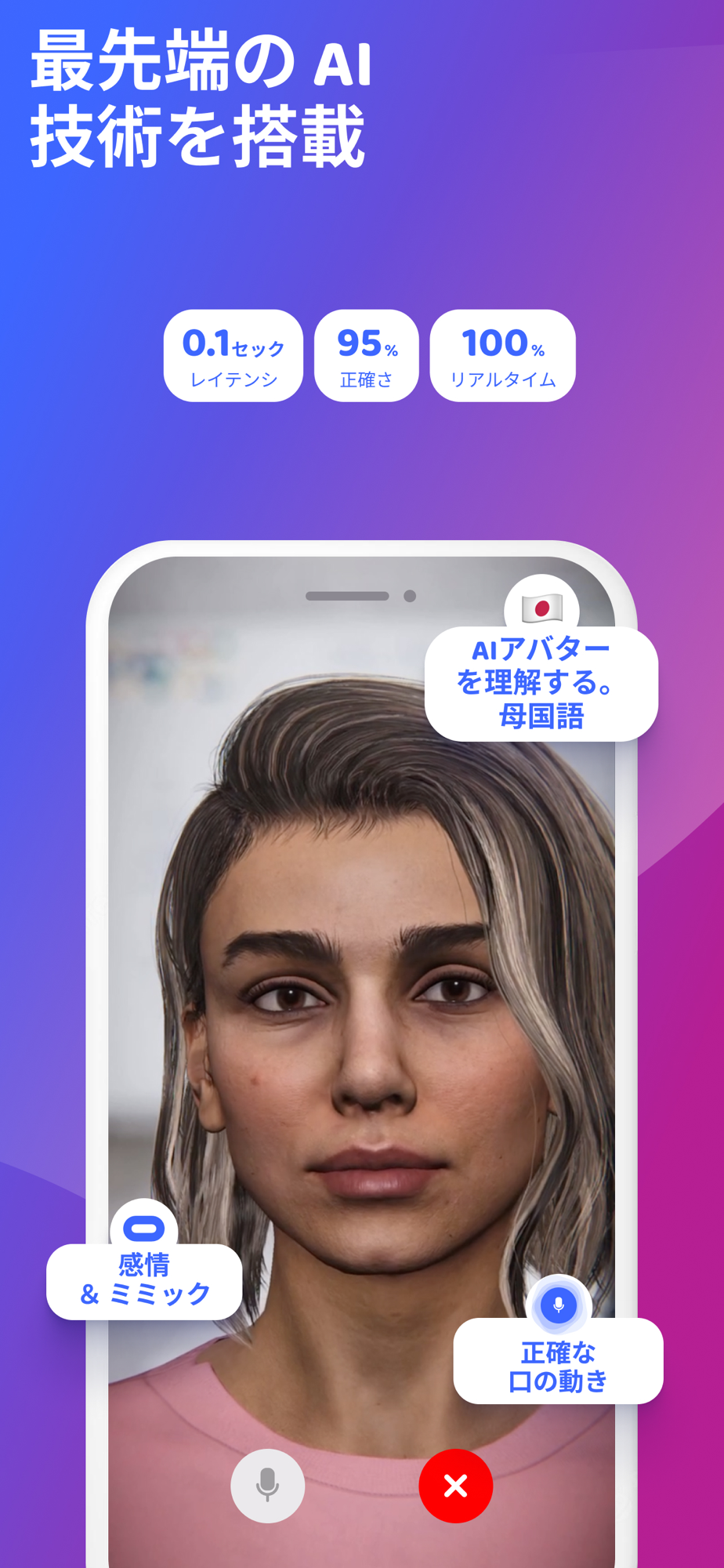 1. 超リアルなアバター: 単なるアニメーションではなく、個性的なアバターによる学習を体験できます。アバターと一緒に有意義な会話をしたり、ロールプレイを練習したり、"Facetime "体験をお楽しみください。アバターがサポートする学習環境の中で、判断することなく、安心して間違いを犯すことができます。