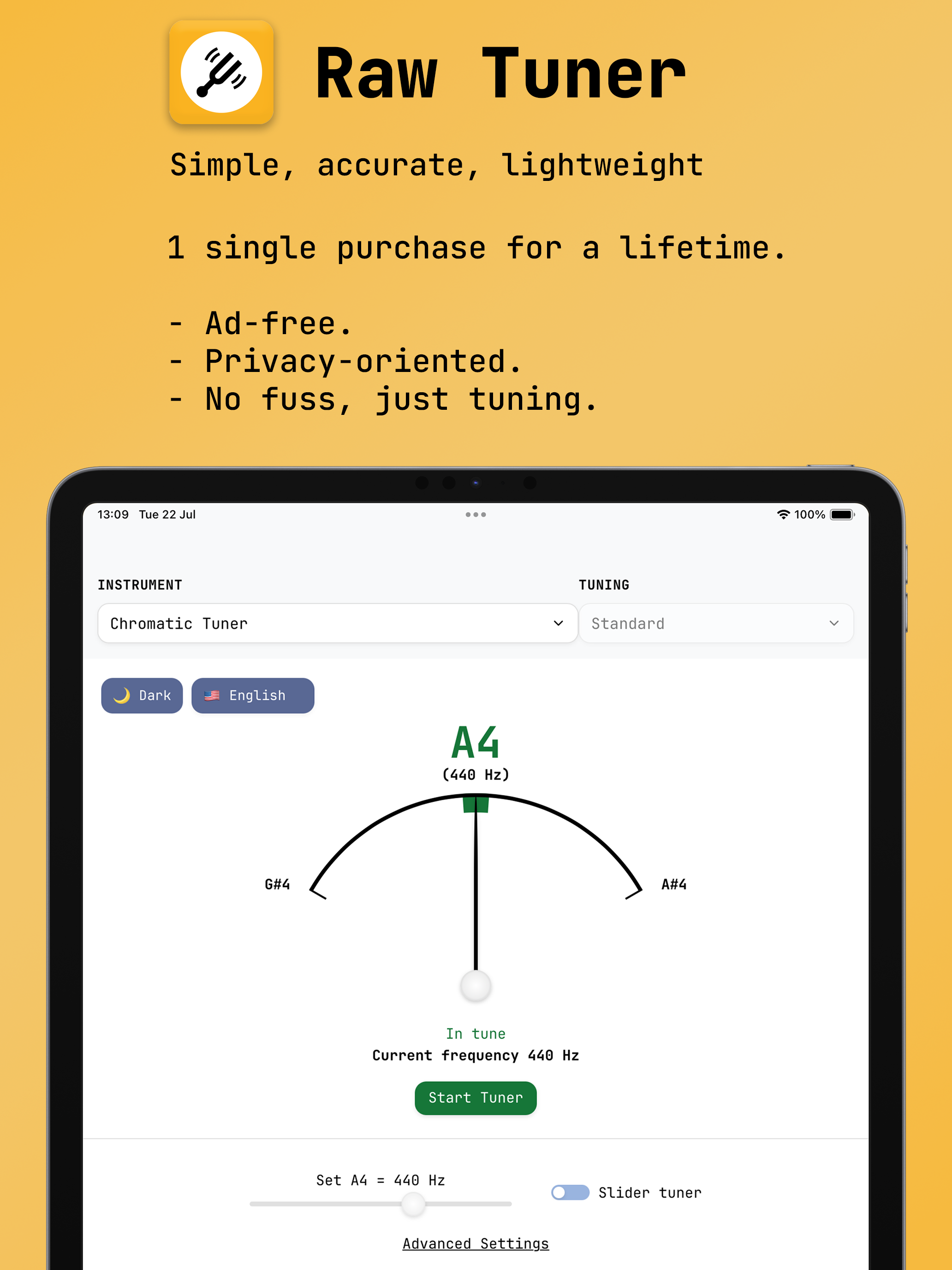 https://OnlineTuner.org を基盤に開発された Raw Tuner は、信頼性の高いオーディオエンジニアリング技術を搭載した、ミュージシャン必携のツールです。