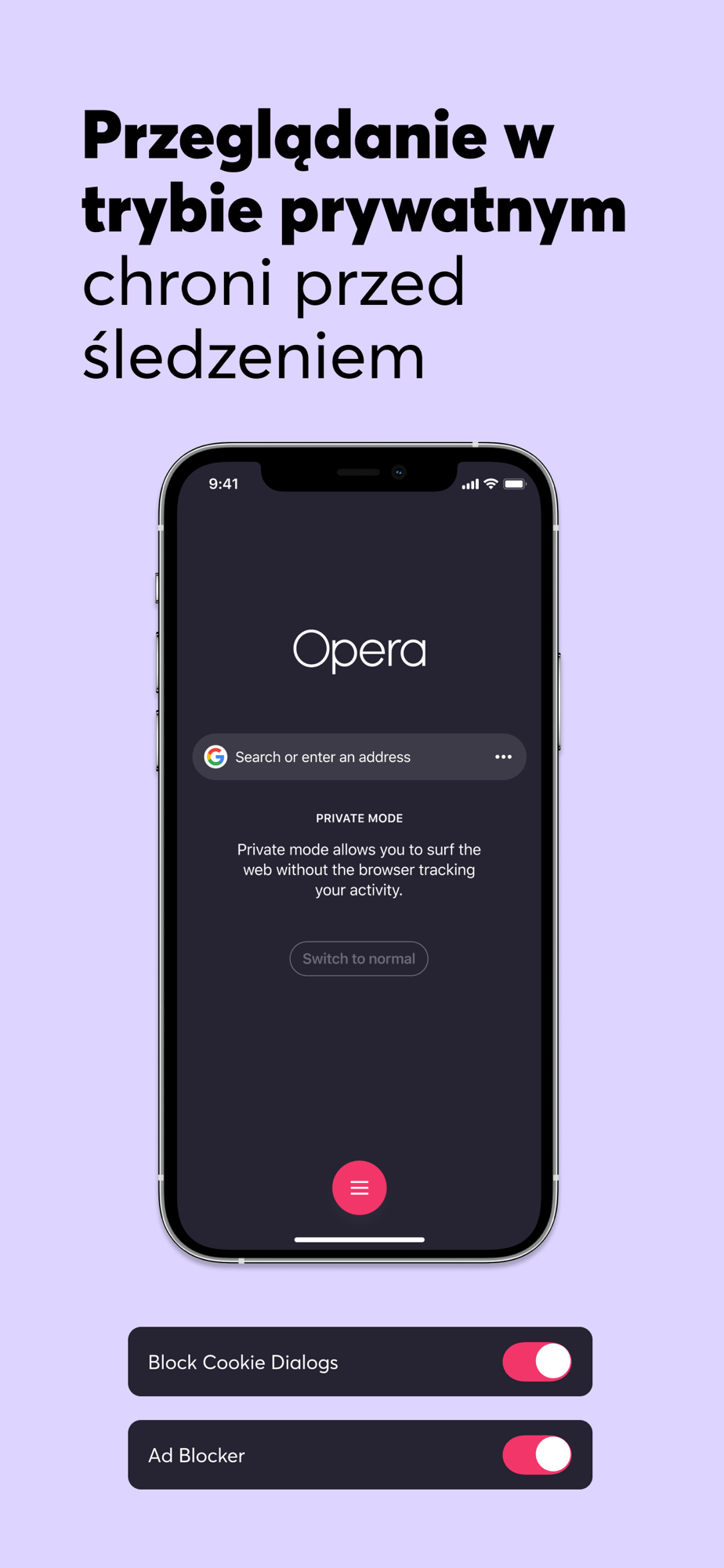 Opera Browser umożliwia przeglądanie sieci jedną ręką, co sprawia, że jest najlepszą i najłatwiejszą w obsłudze przeglądarką dla urządzeń mobilnych z systemem iOS. Możesz wybrać pomiędzy standardową nawigacją na dole ekranu i przyciskiem szybkiego działania. Po wybraniu przycisku szybkiego działania jest on zawsze widoczny na ekranie przeglądarki i umożliwia bezpośredni dostęp do błyskawicznego wyszukiwania. Przytrzymując i przeciągając ten przycisk można uzyskać dostęp do ostatnio przeglądanych kart, odświeżyć obecnie oglądaną kartę, zamknąć ją lub udostępnić przeglądarce na komputery.