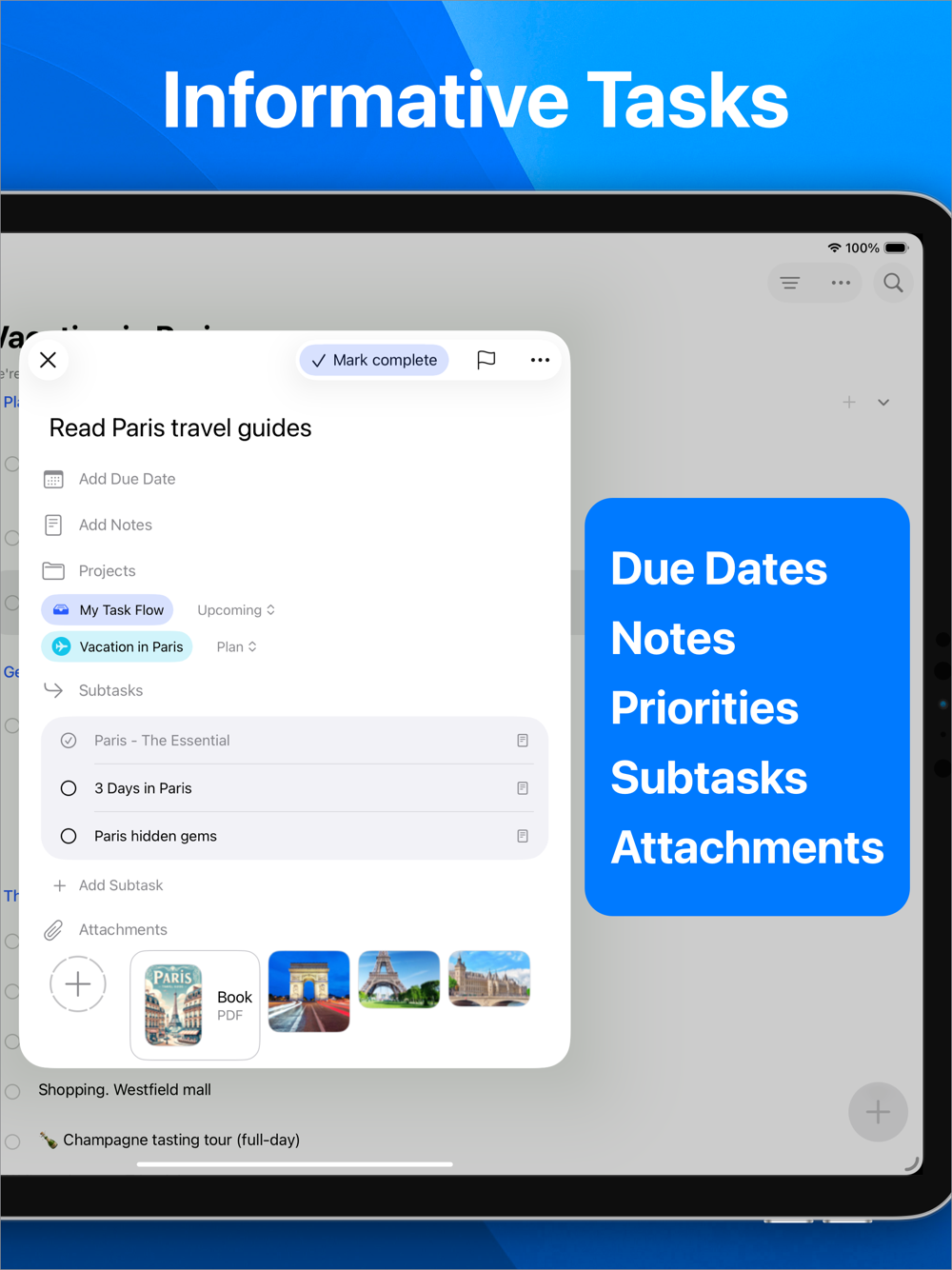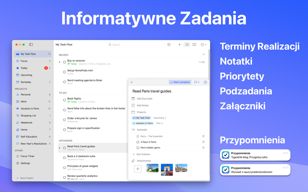 - Szczegółowe informacje o zadaniach: Udoskonal każde zadanie, dodając podzadania, priorytety, notatki i załączniki, w celu uzyskania bardziej szczegółowego i zorganizowanego podejścia. Wyróżnij krytyczne zadania w ramach projektu, przypisując im wyższe priorytety.