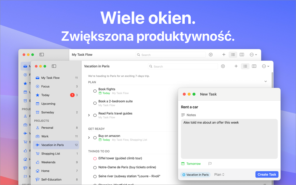 - Integracja wieloprojektowa: Łatwo połącz pojedyncze zadanie, takie jak „kup słodycze do samochodu”, z wieloma projektami, takimi jak „Zakupy” i „Urlop”, aby zachować porządek i efektywność. Zakończenie zadania w jednym projekcie oznacza jego zakończenie wszędzie.