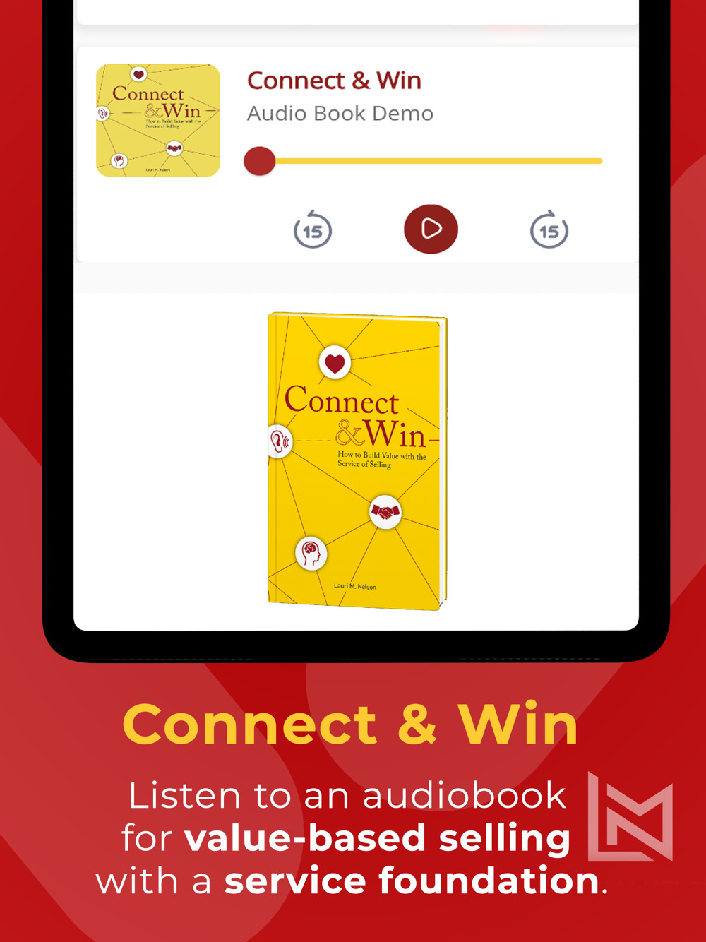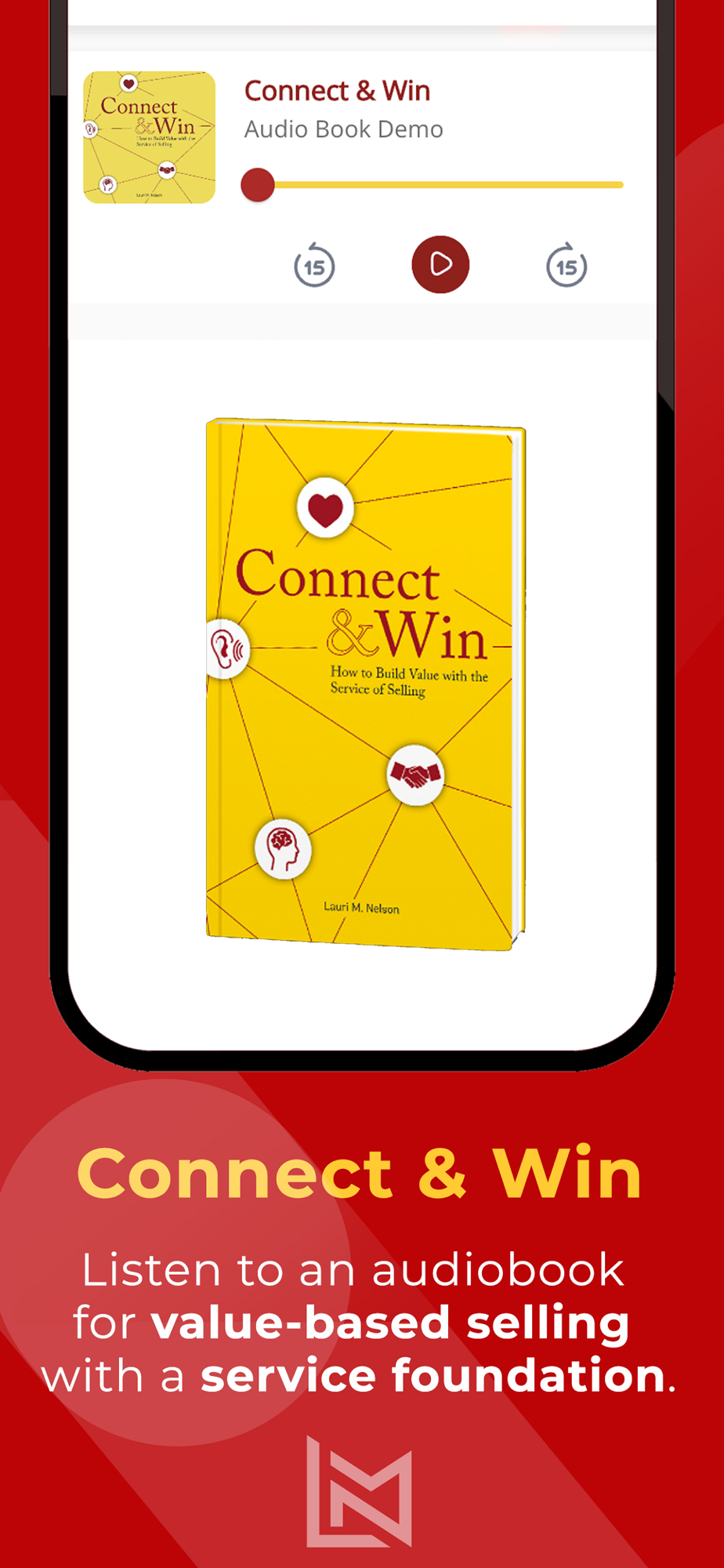 • Have access to the Connect & Win audiobook - value-based selling with a service foundation. Listen to the audio demo, and purchase the full version of this sales program by Lauri M. Nelson designed to help you close more deals, faster.