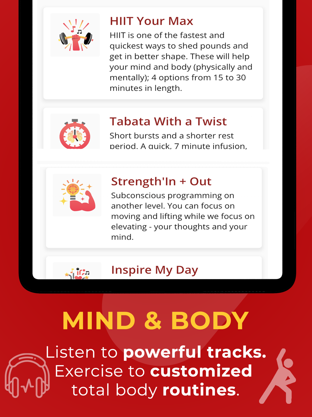 • Watch and exercise to customized total body routines; Basic and Advanced including HIIT, Tabata, and Strength Training with subconscious programming.