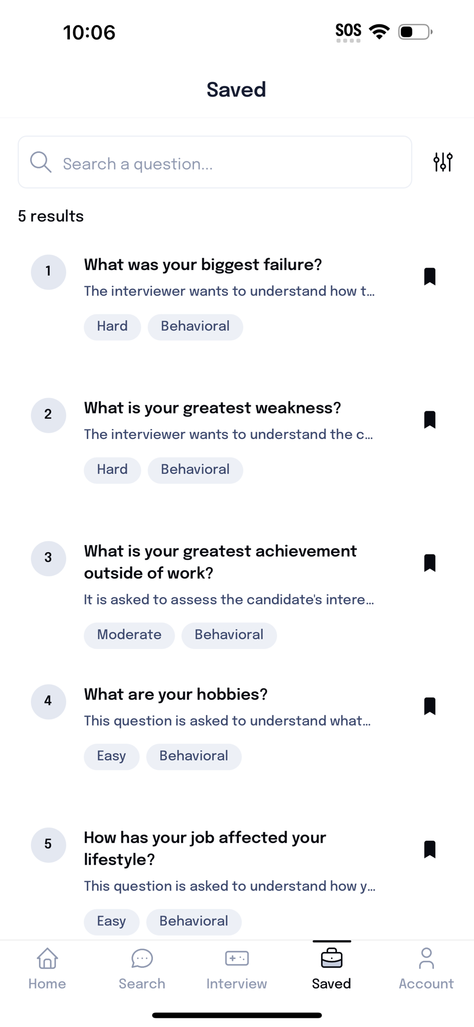 Elevate your interview skills with practice using our Interview Questions and Answers app. With mockup interviews, you'll be able to practice your answers and perfect your technique. Filter your questions by easy, moderate, or hard and get ready for your next interview with confidence.