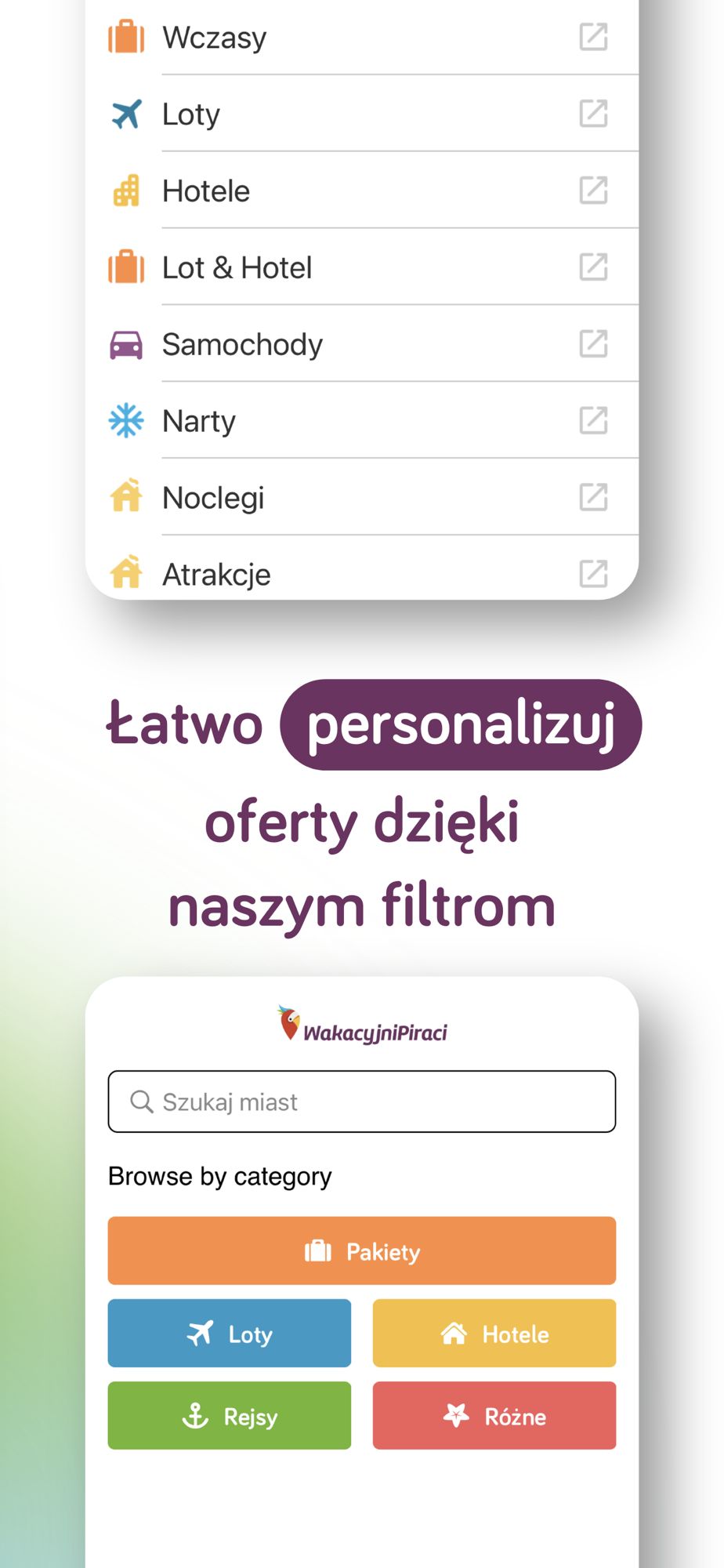 Przejrzyj kategorie ofert, żeby znaleźć to, czego szukasz. Mamy oferty lotów, hoteli, oferty z biur podróży, rejsów i więcej. Możesz przejrzeć wszystkie oferty albo wybrać kategorie, które Cię interesują.
