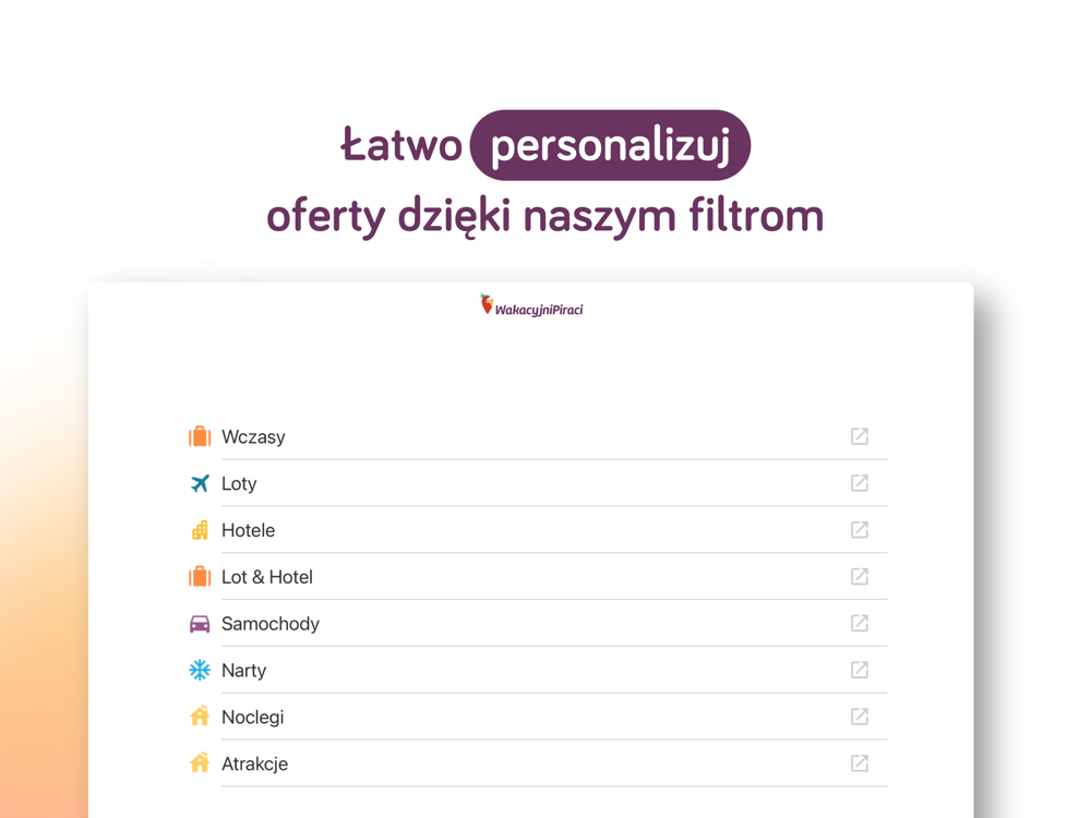 Jeśli wiesz, jakich ofert szukasz, nasze filtry pomogą znaleźć Ci idealny urlop. Np. jeśli szukasz oferty plażowej w Hiszpanii na lipiec lub tanich lotów do Nowego Jorku, wystarczy kliknąć na filtry i uzupełnić Twoje preferencje. Oferty możesz filtrować ze względu na kategorię, miejsce wylotu, kierunek oraz czas podróży.
