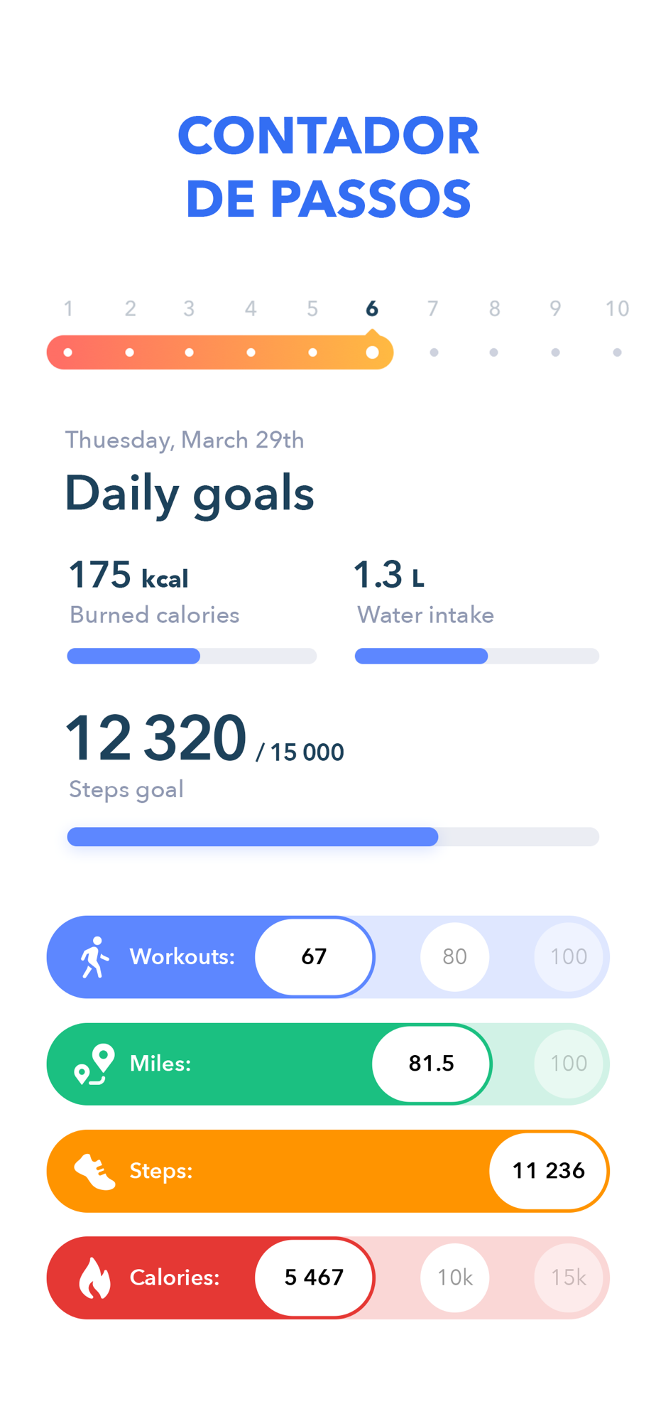 • E com o acompanhamento avançado de progresso, nunca perderá de vista o que deseja alcançar. Todos os seus passos e calorias, no caminho para objetivos maiores, serão medidos, calculados e registados com precisão nas suas estatísticas de progresso.