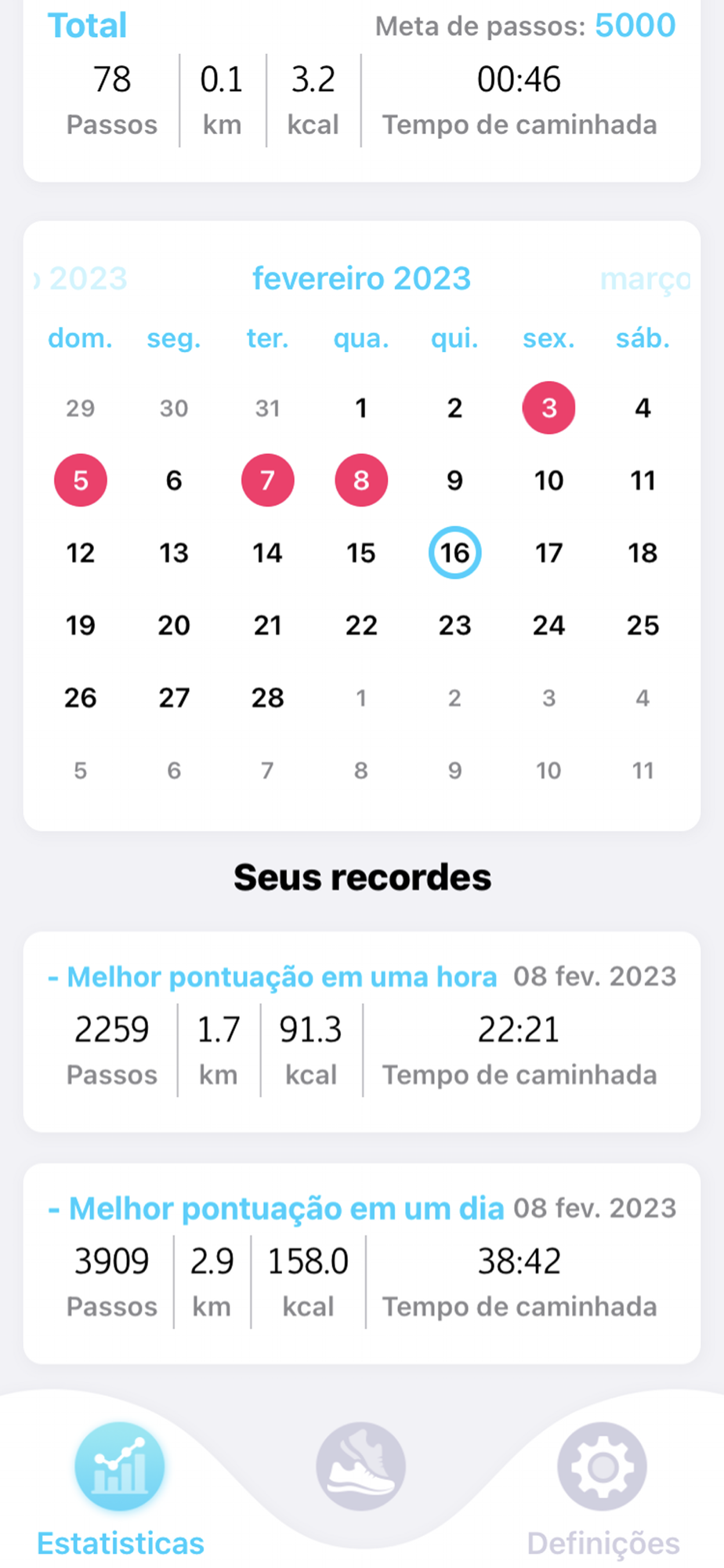 Se você quer ficar em boa forma, você precisa fazer vários thosand passos todos os dias. Caminhar é altamente benéfico para a sua saúde, porque treina o seu coração, ajuda a perder peso, ativa vários processos em seu corpo, e evern substitui uma série de outros exercícios físicos. Então vamos andar, ficar mais magros e saudáveis! Analise os seus relatórios diários para saber quanto andou e que distância percorreu.