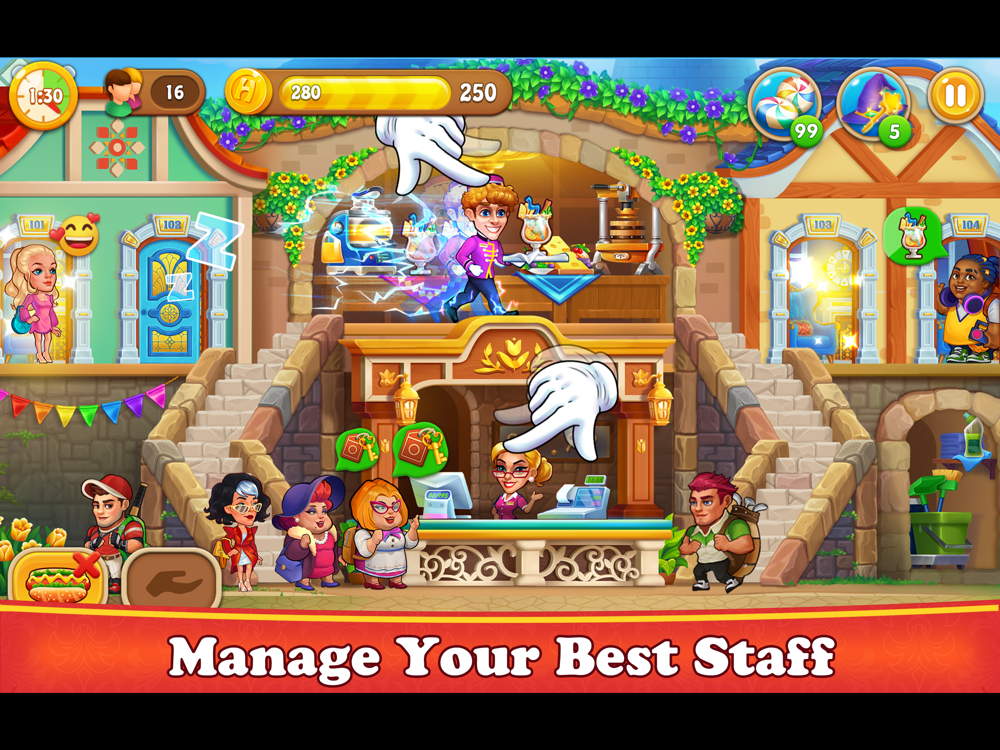 Gerenciar hotéis e controlar sua equipe são muito importantes nesses jogos de hotelaria. Durante os horários de pico, o número de visitantes do seu hotel fica muito lotado, não se esqueça de usar itens de incentivo no jogo do hotel. É a hora mágica de agilizar o serviço de seu hotel e superar desafios difíceis.
