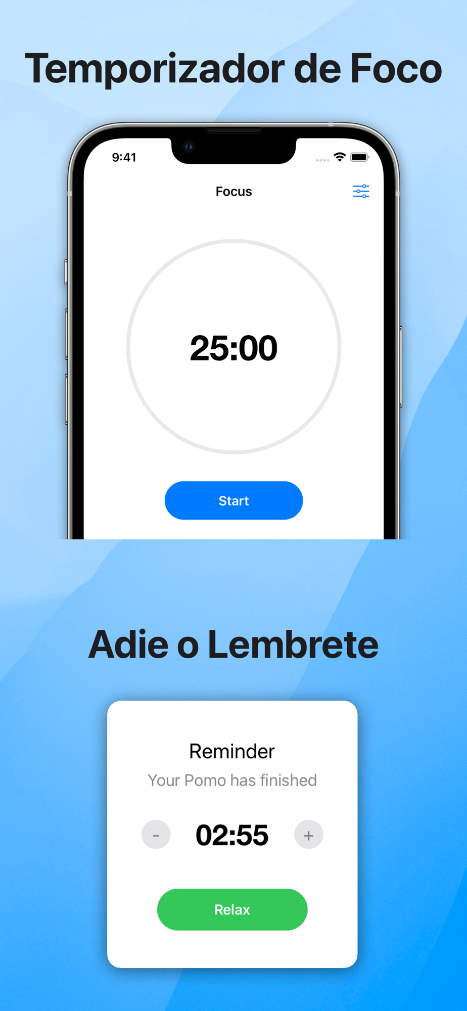 - O Temporizador de Foco oferece uma maneira de garantir que você esteja focado na tarefa em mãos, mesmo quando você poderia se distrair. Defina um temporizador para o tempo que você deseja trabalhar e depois faça uma pausa para recarregar as baterias. Precisa de mais alguns minutos para terminar uma tarefa? Você pode adiar o final de um temporizador para dar um pouco mais de tempo. Uma opção contínua garante que você não perderá o final de uma sessão.
