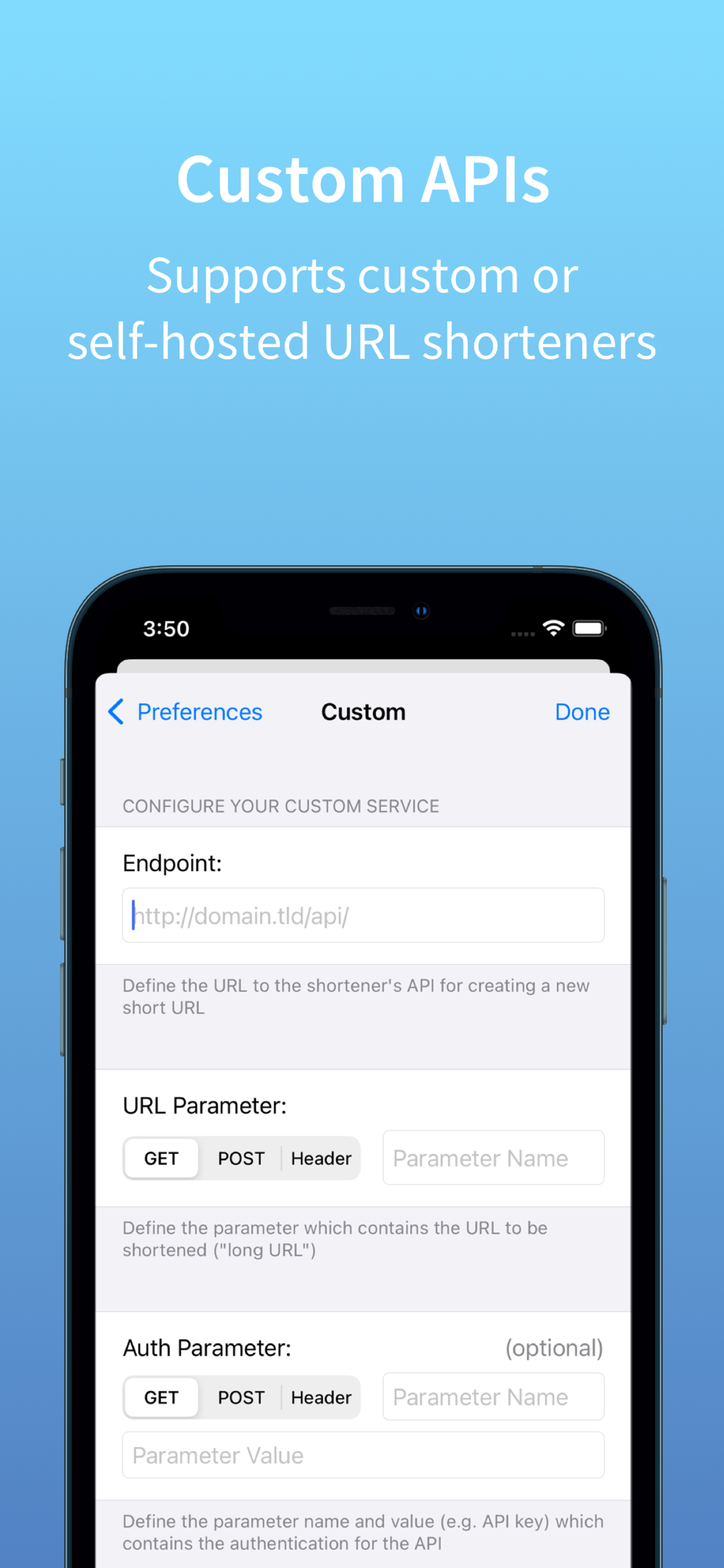 Shortshare supports the major features of the URL shortener services, e.g. custom domains or custom URL parameters for your shortened URLs.
