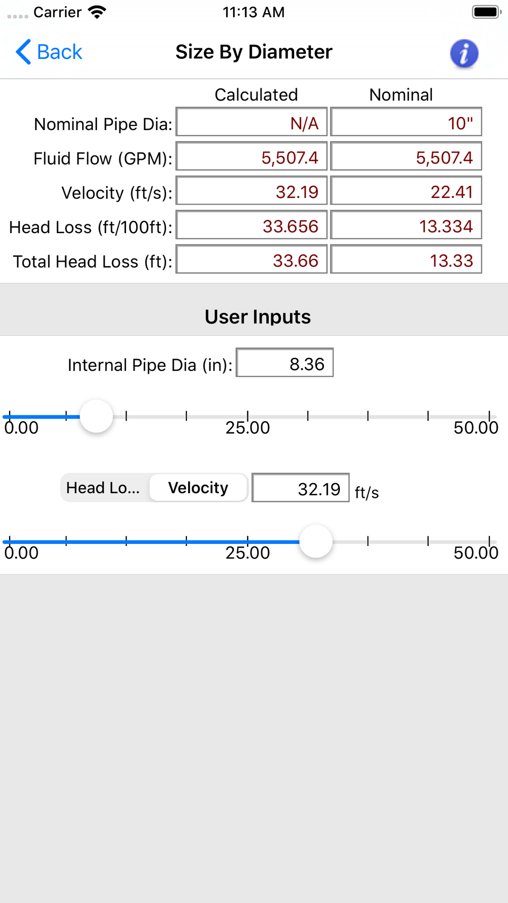 You can specify the total fluid flow in GPM (or L/s) and one of either unit head loss (ft/100ft), pipe internal diameter (inches) or fluid velocity (ft/s) parameters. The results include both the exact and nominal pipe diameters and the calculated velocity and total head loss. If you are analyzing an existing pipe system, there is an option to input the existing pipe internal diameter and one of either unit head loss or fluid velocity parameters to derive the calculated fluid flow and other remaining properties.