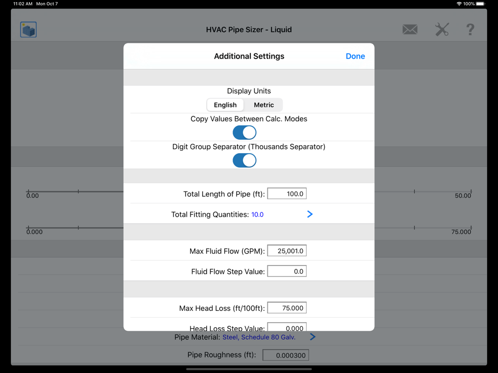 You can specify additional parameters such as the type of liquid, various properties of the liquid, the pipe material type, the total length of pipe, quantities for up to 11 different types of pipe fittings, and much more. You can also choose to display values in either english or metric units.