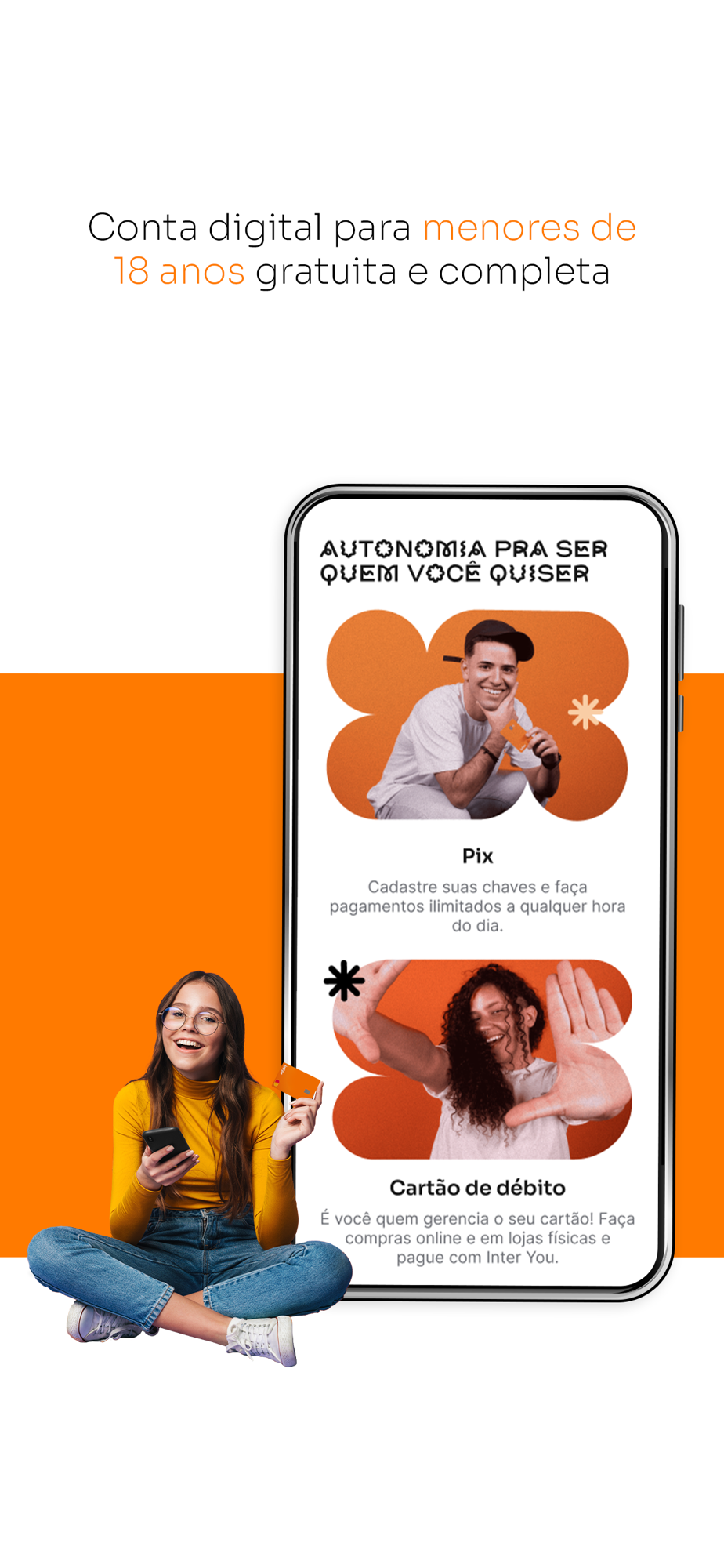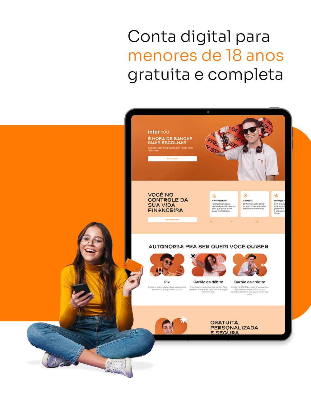 No Inter você encontra duas opções de conta para menores de 18 anos completas e gratuitas. Com a Conta Kids você planeja e investe no futuro dos seus filhos. Já a Inter You, é para jovens que desejam aprender a gerenciar o seu próprio dinheiro e ter independência.