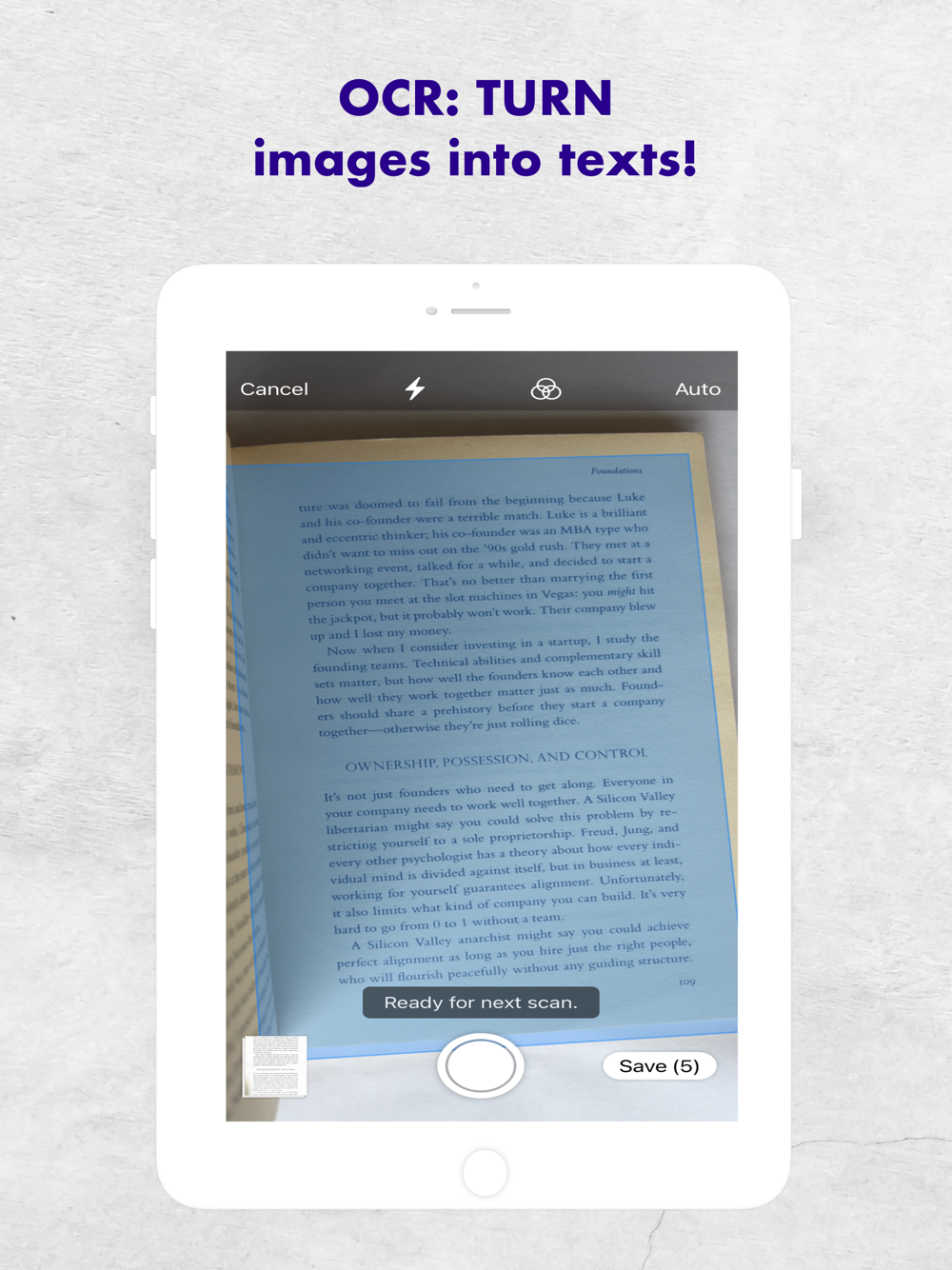 - Automatic mode of scanning detects text borders automatically so you don't have to.